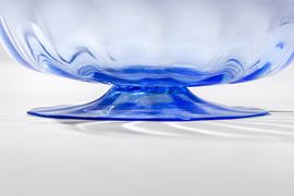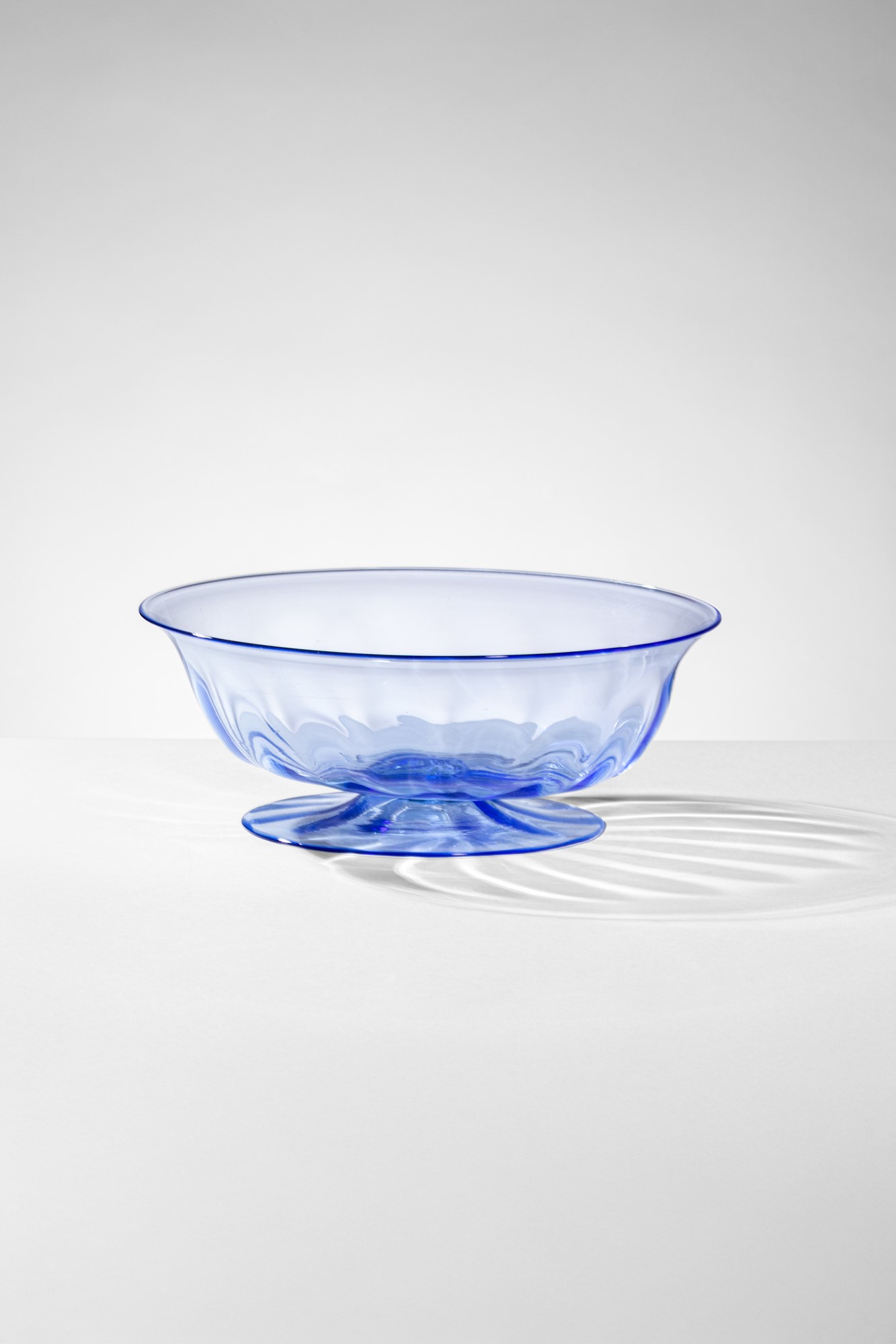 Vetro soffiato bluino lievemente baccellato con piede a disco applicato a caldo.