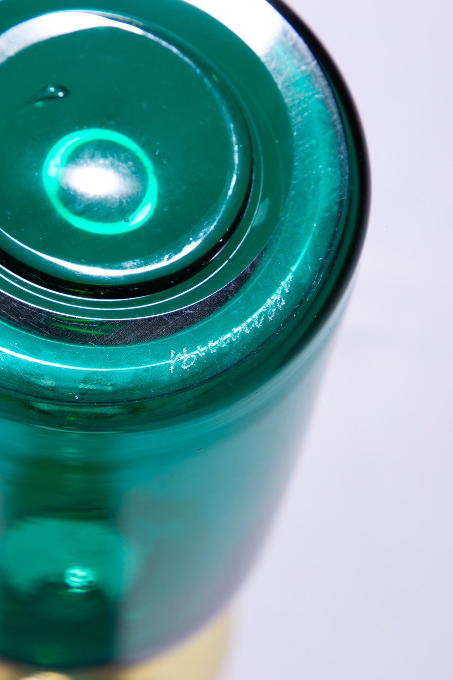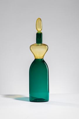 Vetro soffiato lavorato con incalmo nei colori verde e giallo.