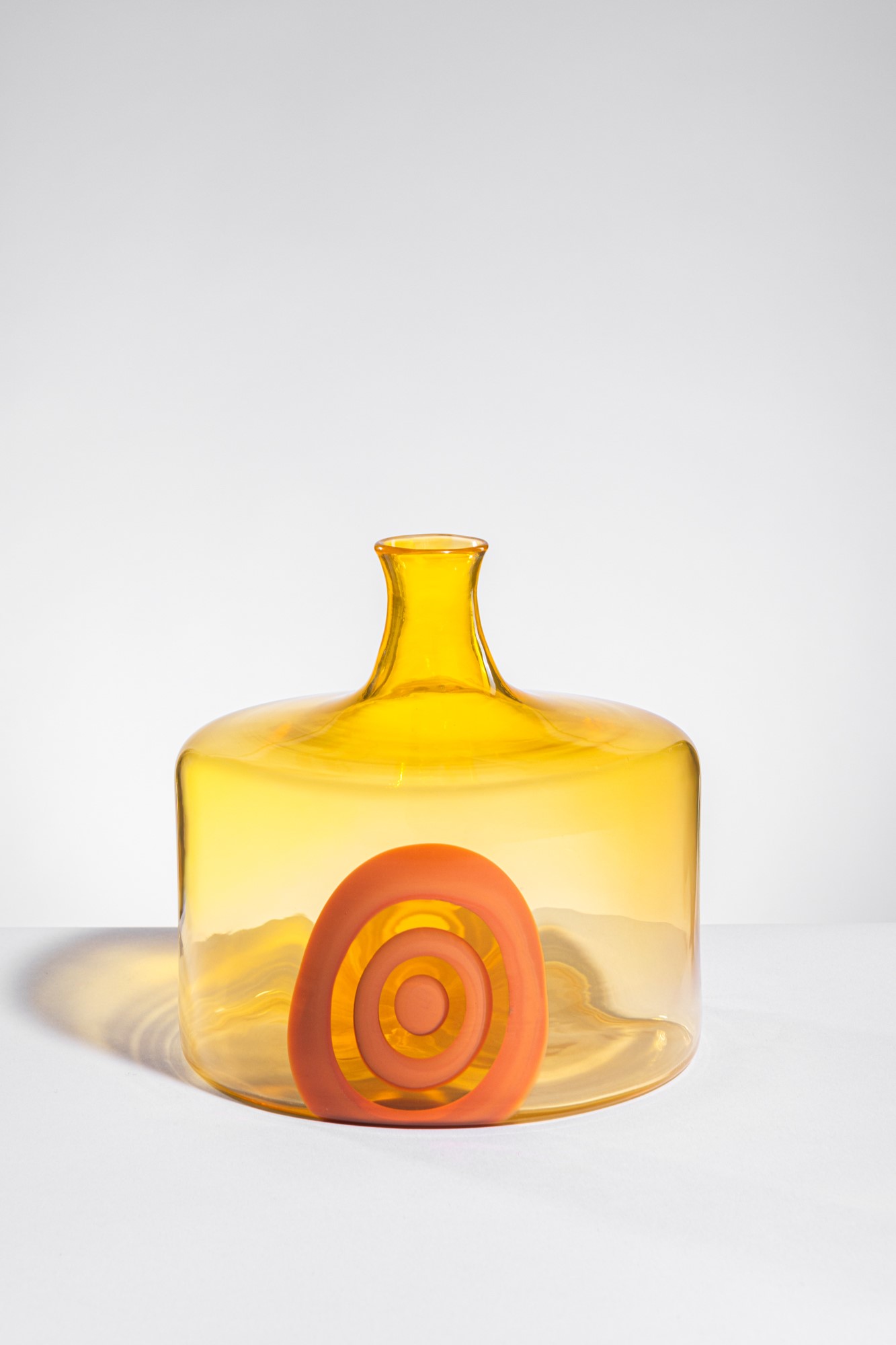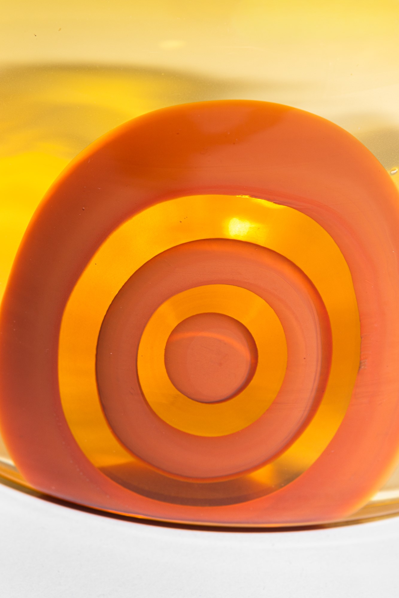 Vetro soffiato giallo sole decorato con una grande murrina.