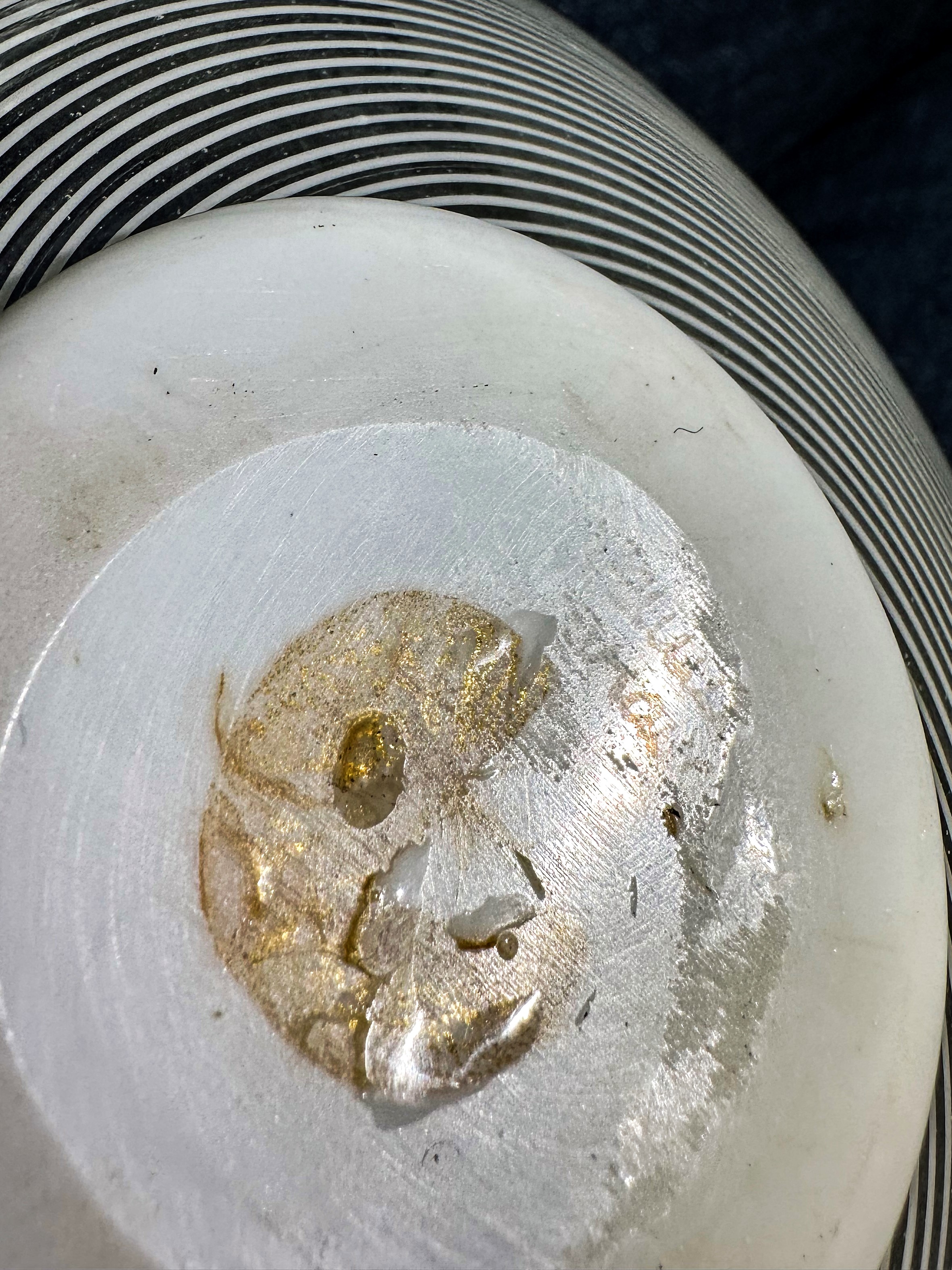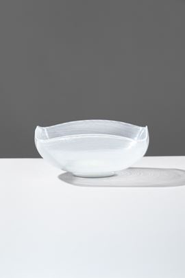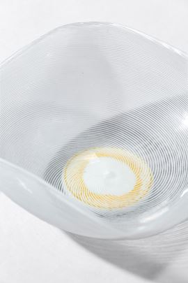 Vetro soffiato lavorato a mezza filigrana con base lattimo e foglia