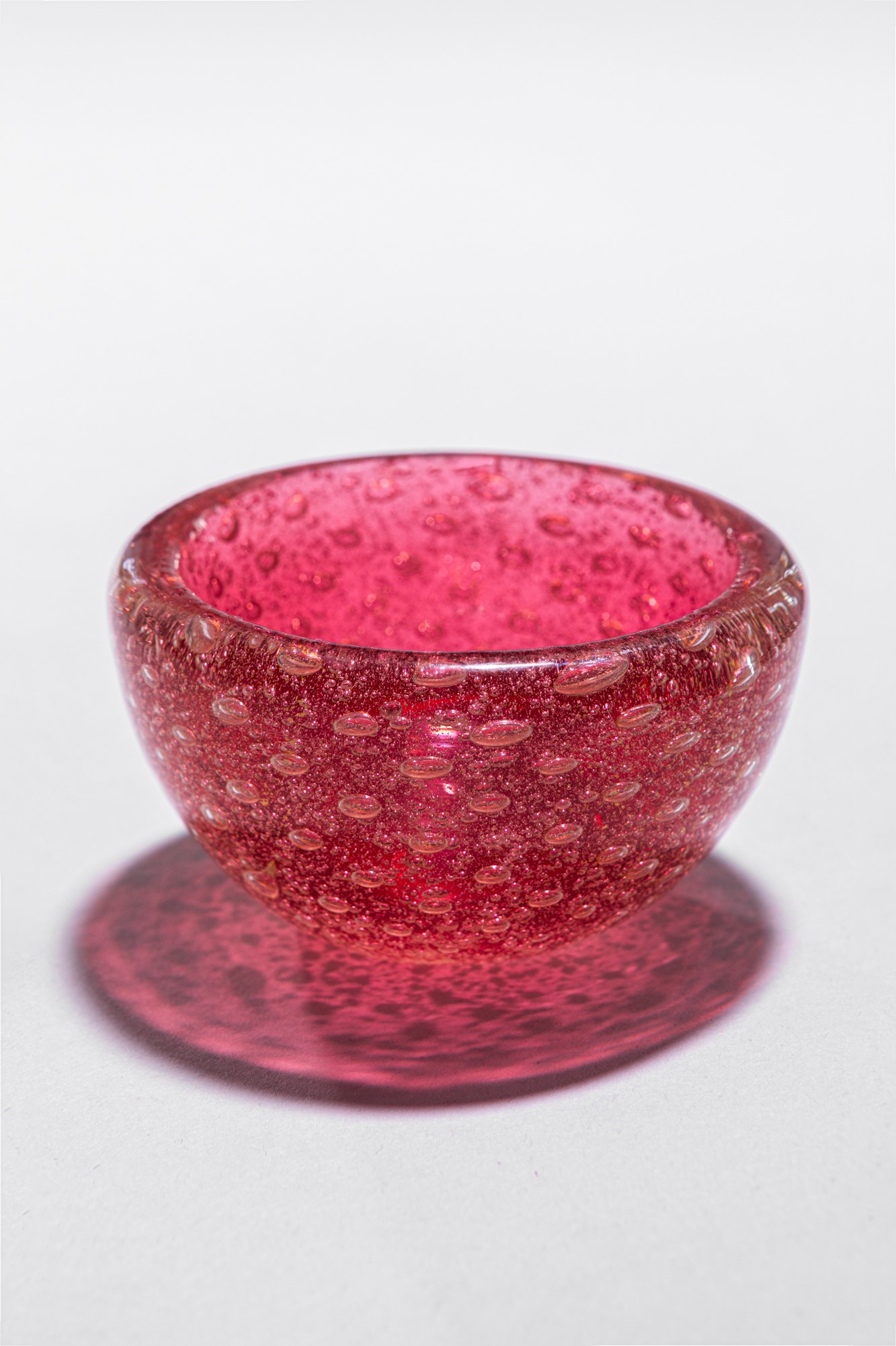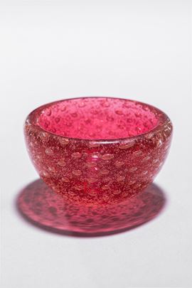 Vetro soffiato rosso con inclusione di bolle regolari.