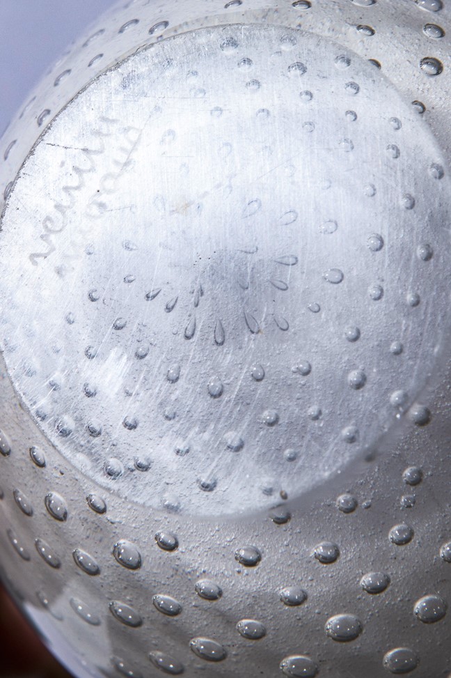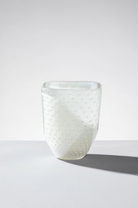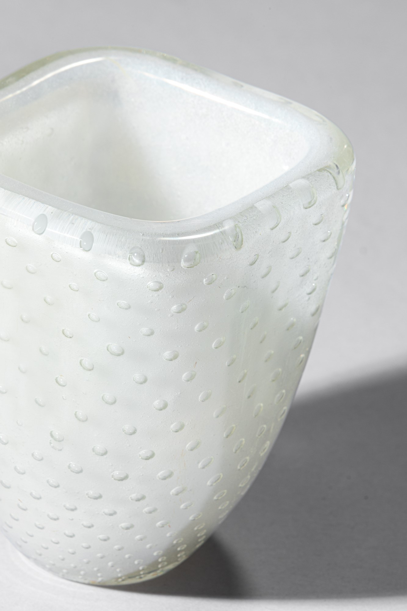 Vetro soffiato sommerso lattimo con inclusione di bolle regolari.