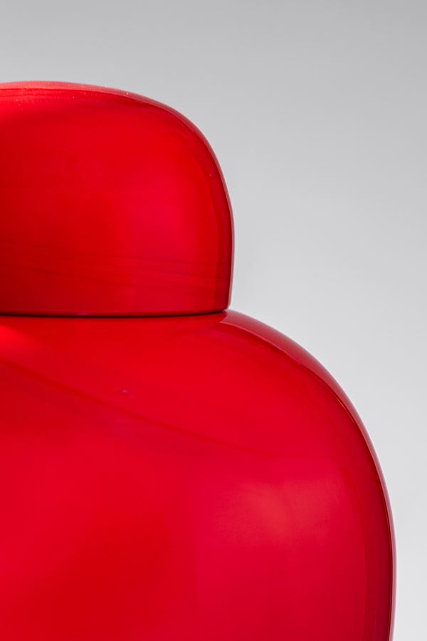 Vetro soffiato rosso opaco con forme ispirate all'arte orientale.