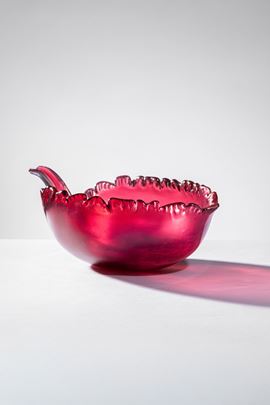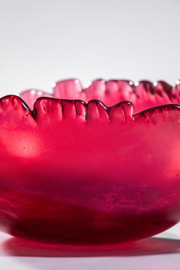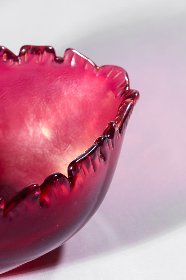Vetro soffiato prugna con bordo merlettato e superficie iridata.