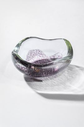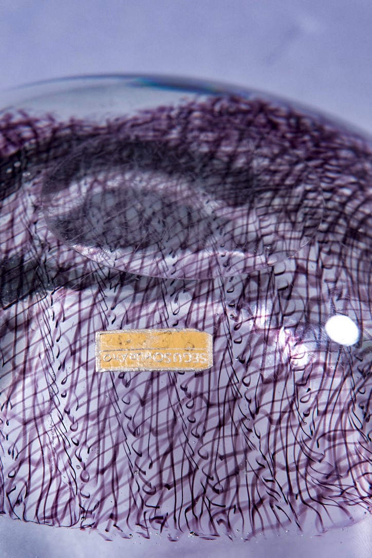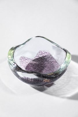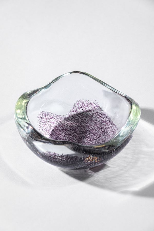Vetro soffiato cristallo di grosso spessore con inclusione di fili ametista a guisa di pizzo.