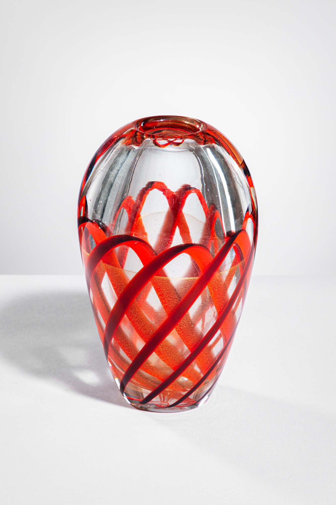 Vetro soffiato cristallo lavorato con nastro richiamato rosso/bruno nella parte inferiore, sommerso in parte con foglia d’oro.
