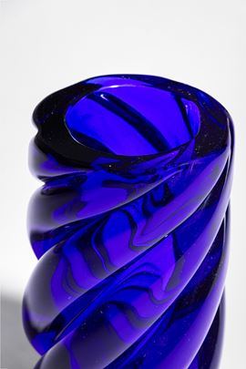 Vetro soffiato blu a larghe coste disposte a spirale.