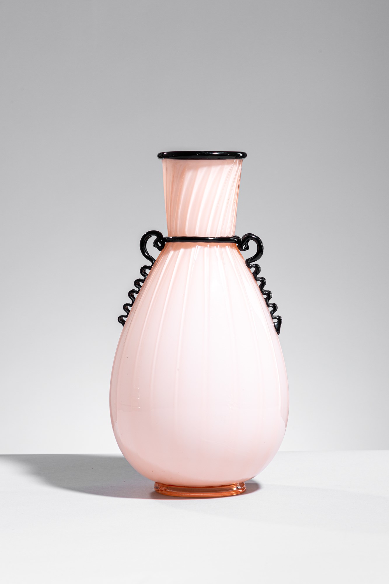 Vetro soffiato incamiciato rosa con anse e bordo in pasta vitrea nera applicati a caldo.