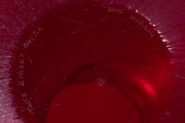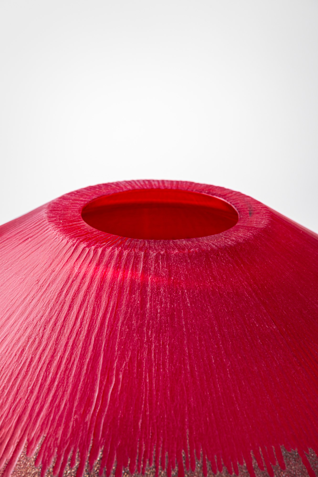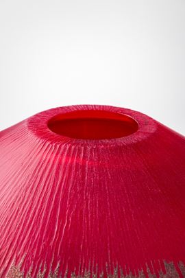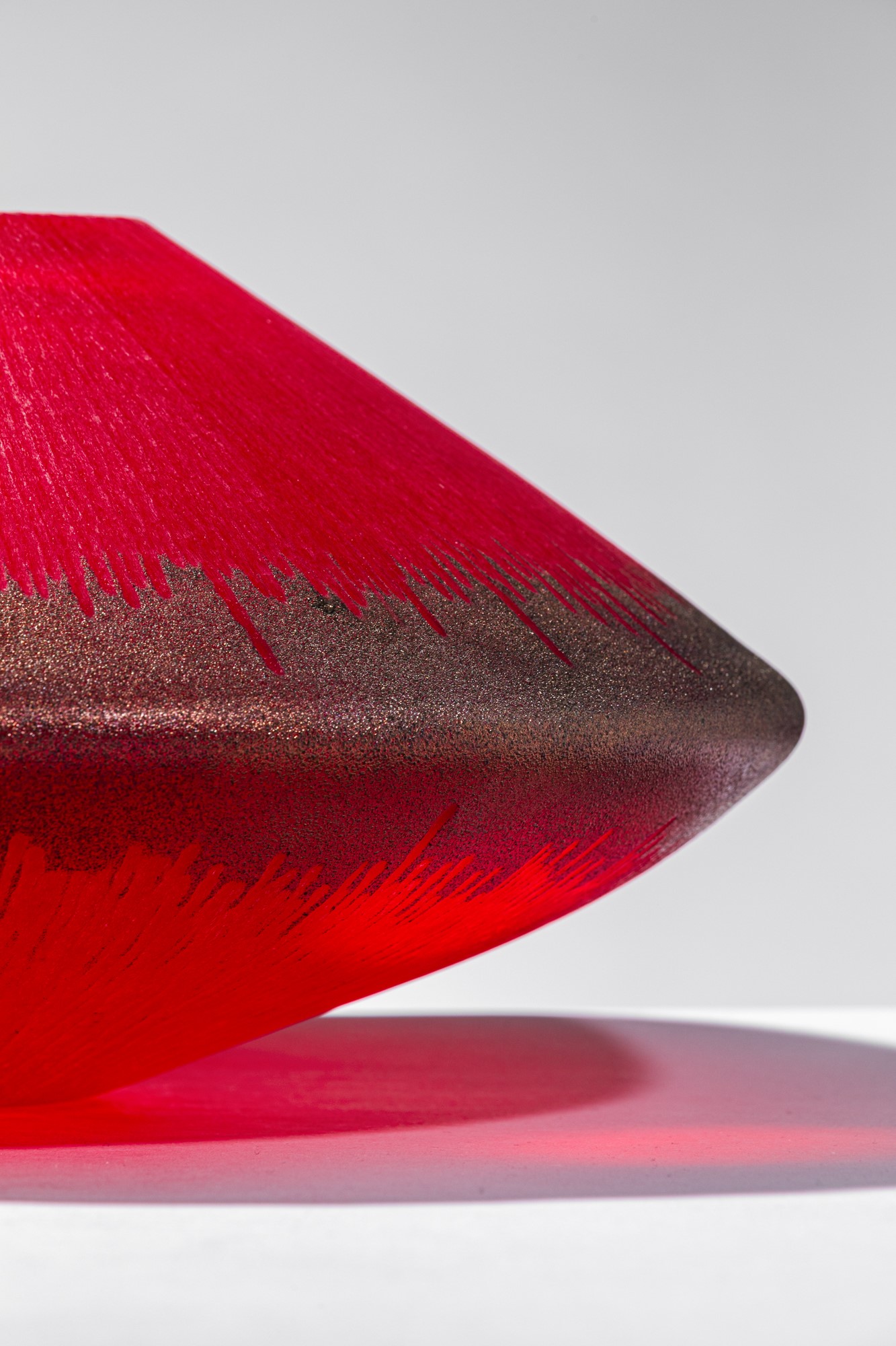 Vetro soffiato rosso con bordo oro, superficie incisa alla mola.
