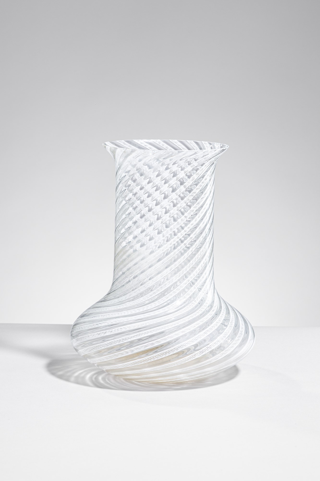 Vetro soffiato decorato a cannette zanfirico lattimo.
