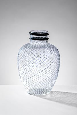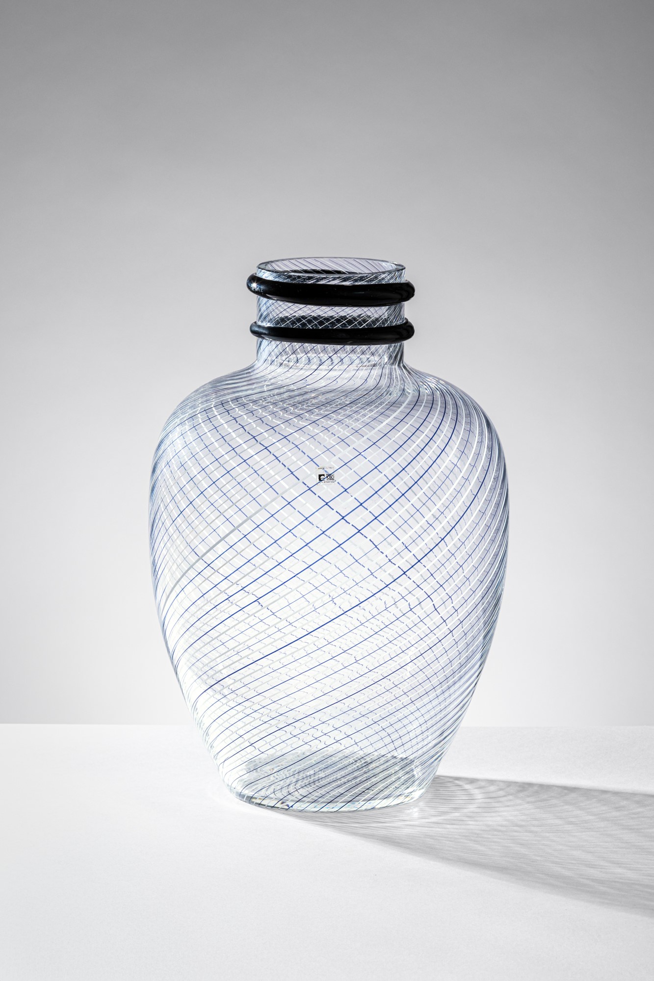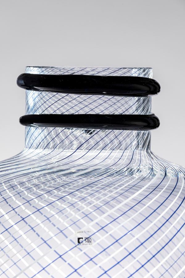 Vetro cristallo con inclusione di fili neri e lattimo, due fasce nere applicate a caldo sul bordo.