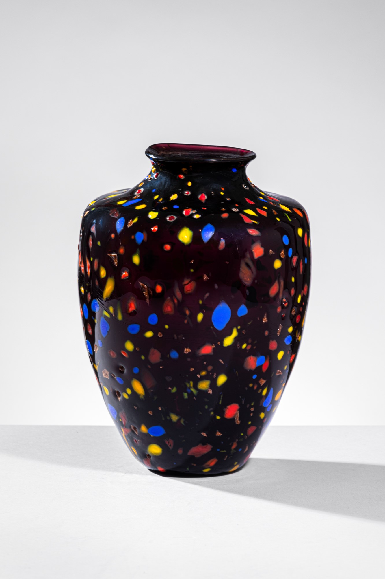 Vetro soffiato lavorato a macchie policrome su tutta la superficie.