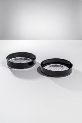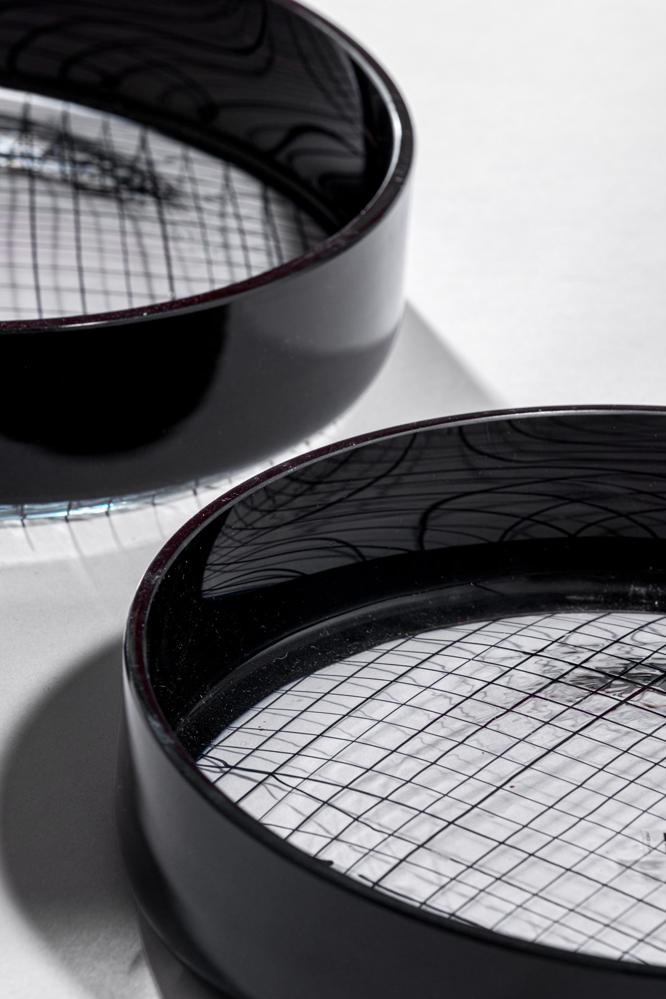 Vetro soffiato cristallo con bordo nero ed inclusione di fili neri disposti a reticolo nella parte centrale.