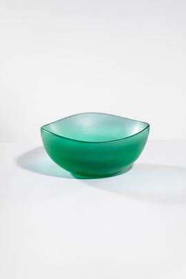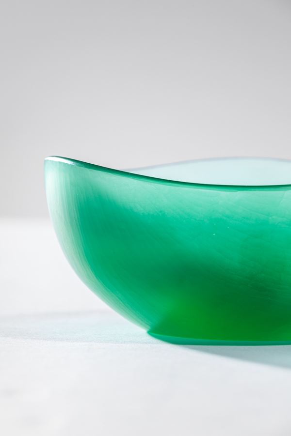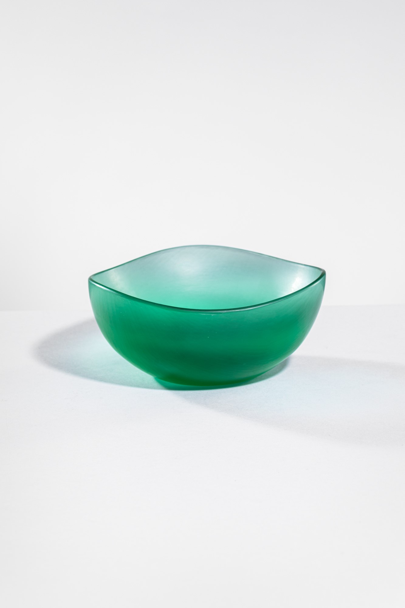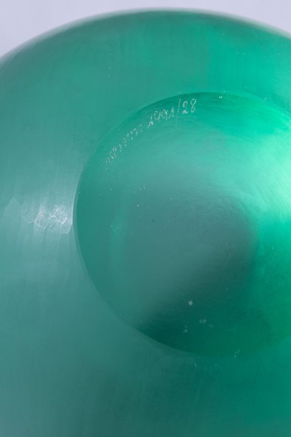 Vetro soffiato verde, battuto, rifinito alla mola.