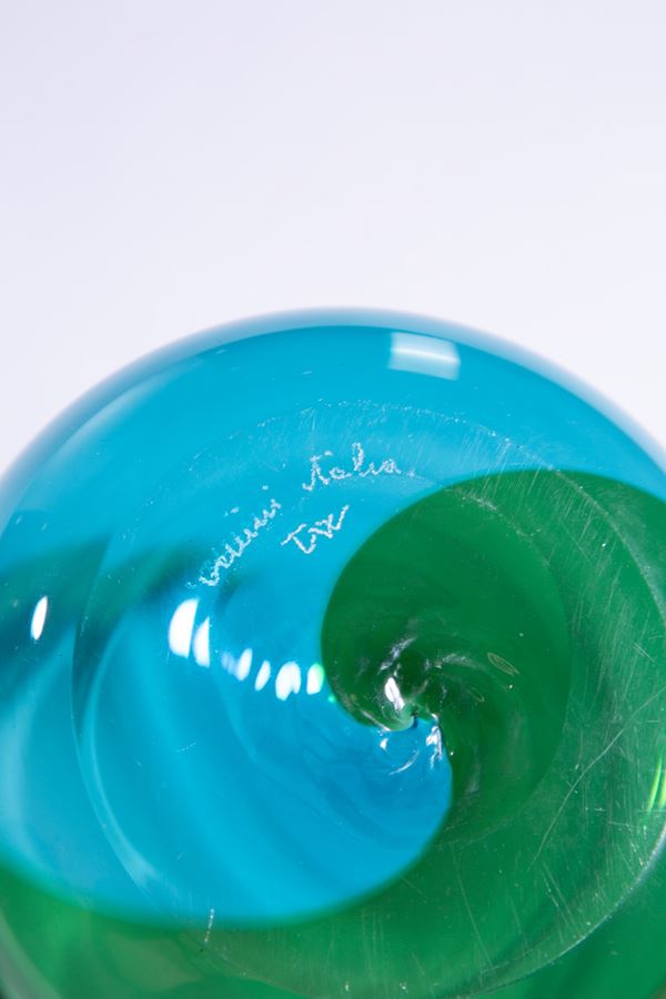 Vetro trasparente soffiato a larghe fasce ritorte acquamare e verde.