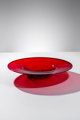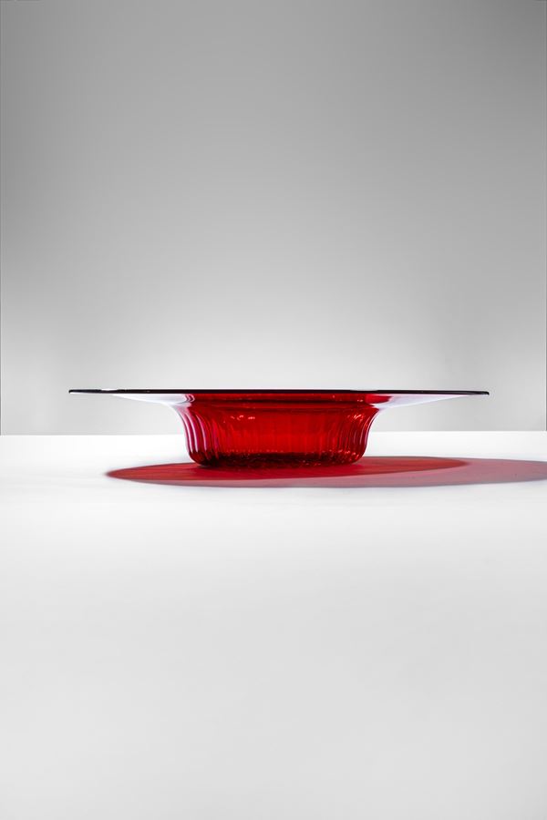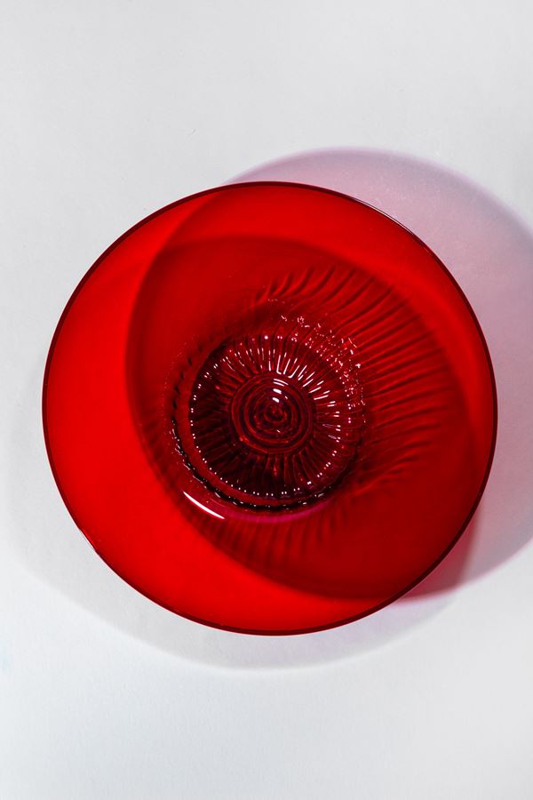Vetro soffiato trasparente rosso con fondo baccellato.