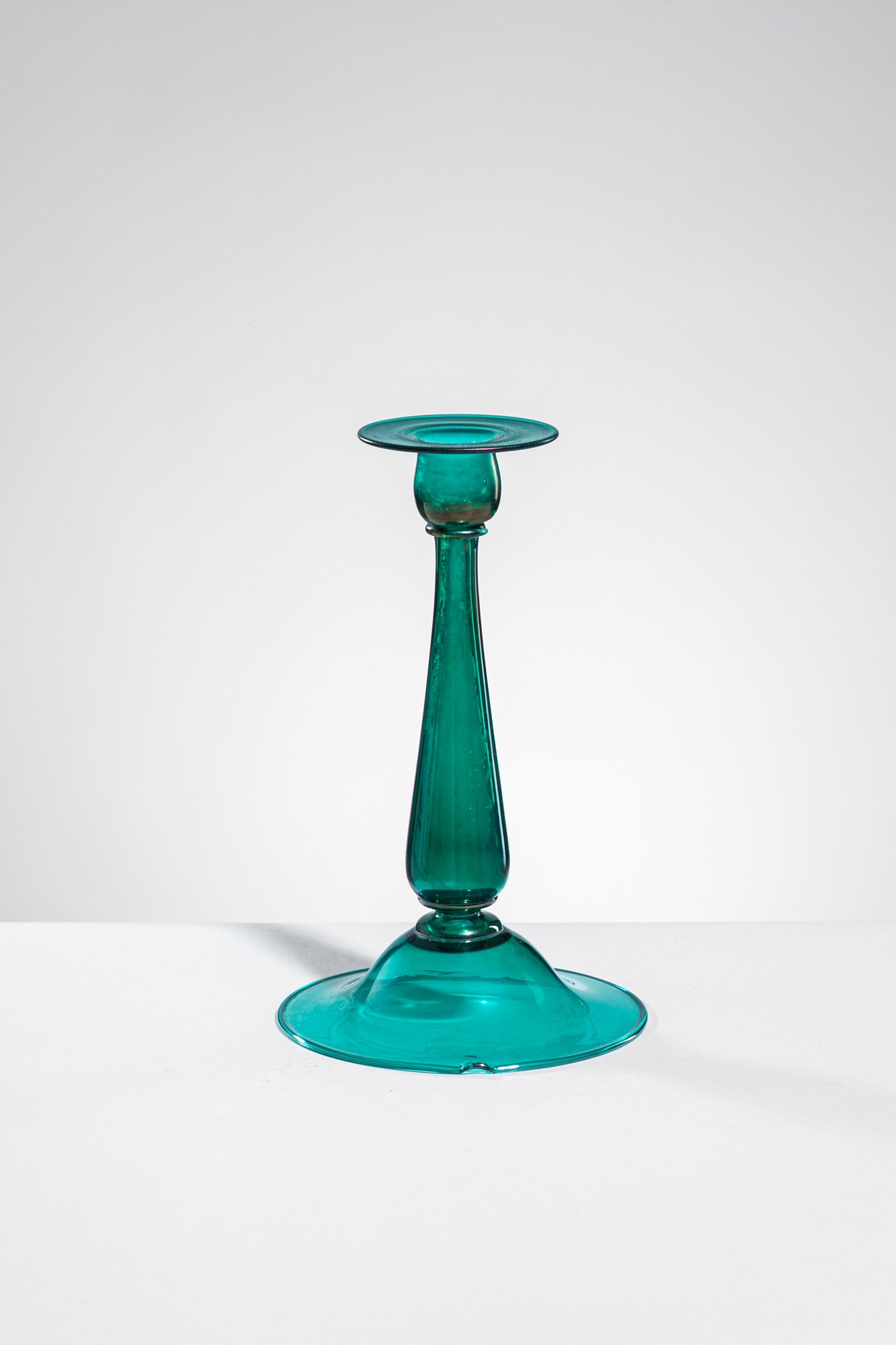 Vetro soffiato trasparente verde, piede a disco applicato a caldo.