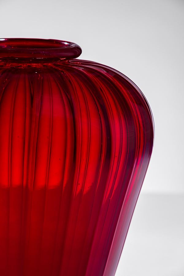 Vetro soffiato trasparente rosso rubino, corpo costolato.