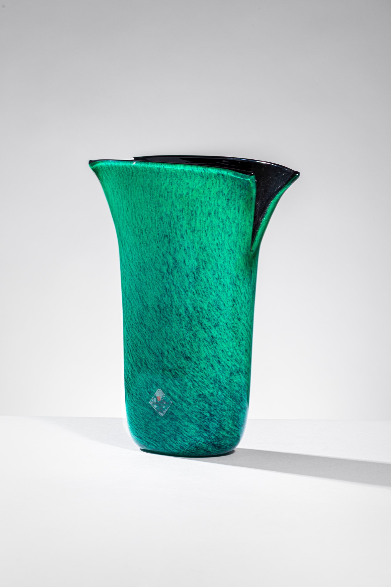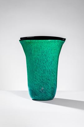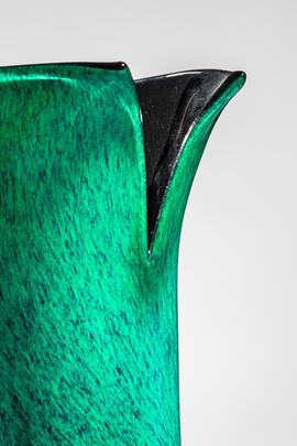 Vetro soffiato incamiciato verde e nero con tagli all’estremità dell’apertura.