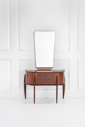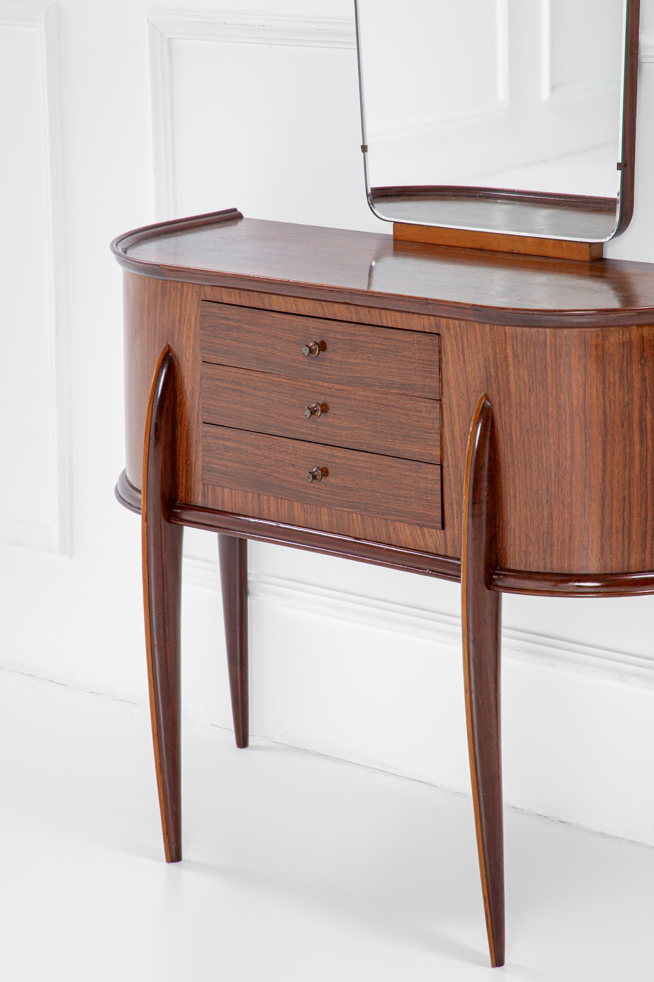 Legno massello sagomato di essenze diverse, legno impiallacciato, vetro specchiato.