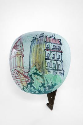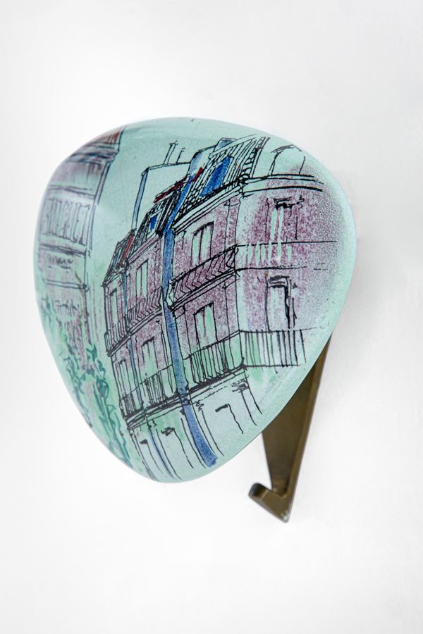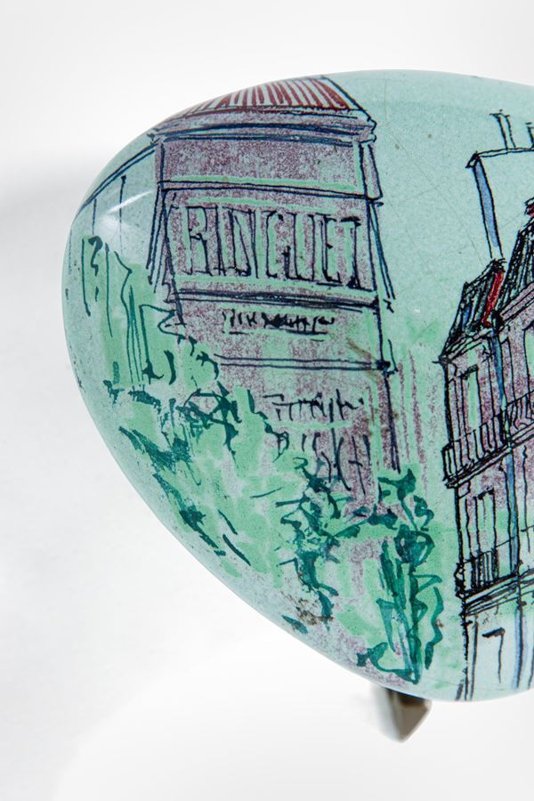 Ceramica smaltata e decorata in policromia con vedute di Parigi, ottone.