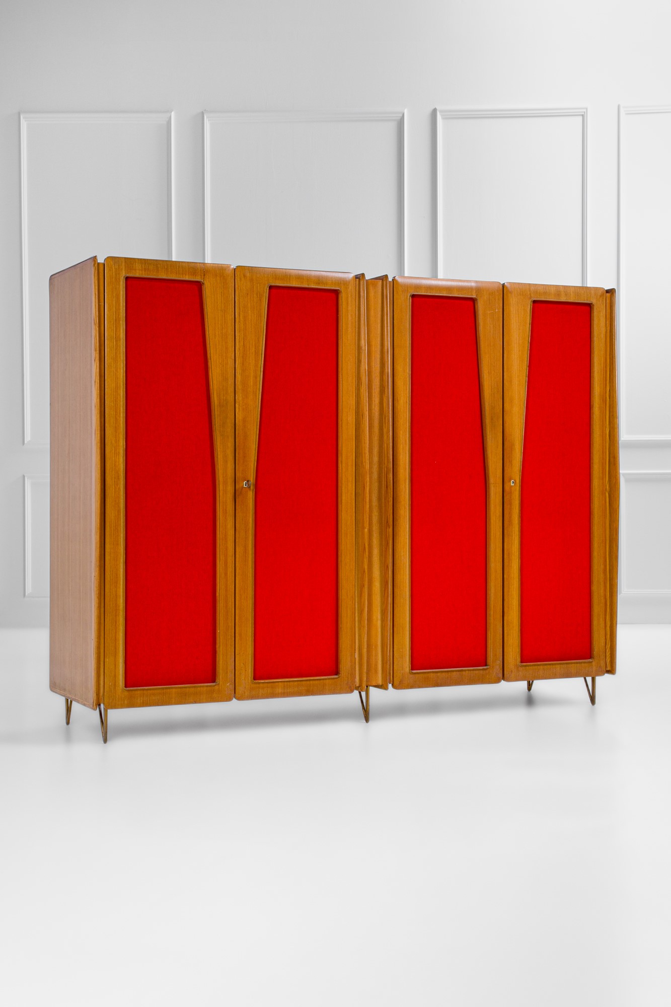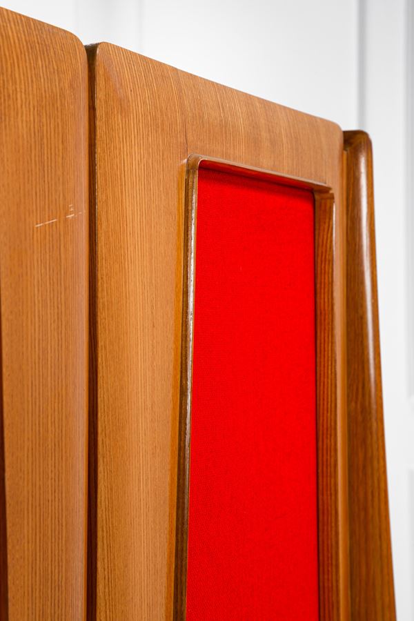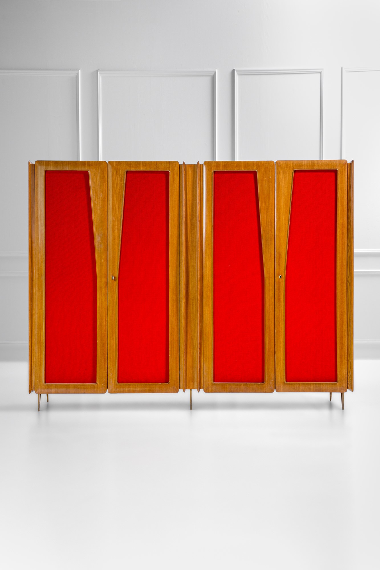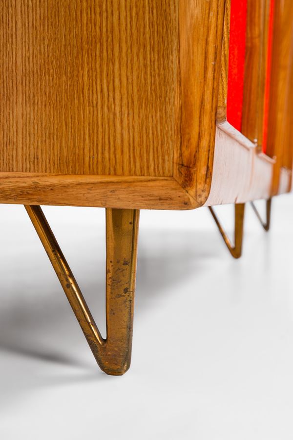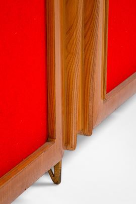 Legno impiallacciato, compensato, tessuto, ottone, vetro specchiato.
