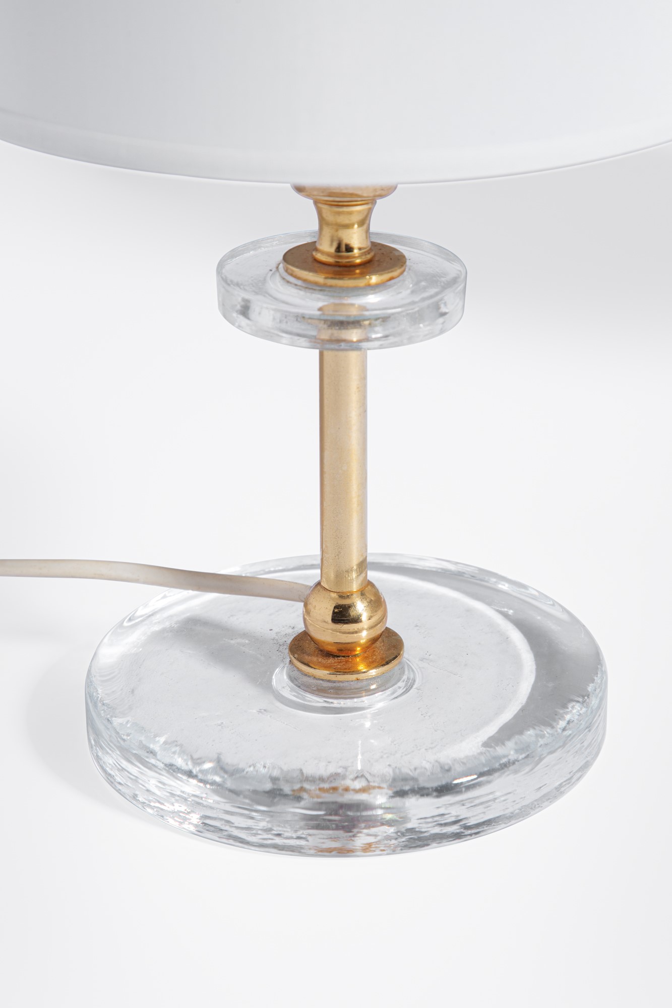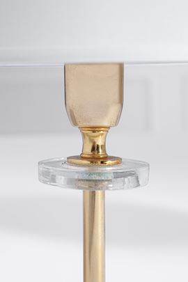 Metallo dorato, vetro trasparente, tessuto.