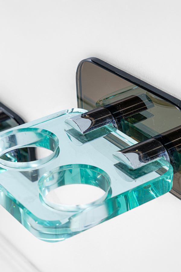 Vetro di forte spessore fumé e cristallo, metallo cromato.