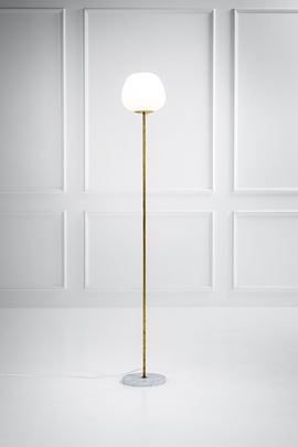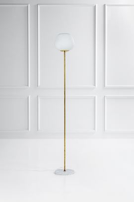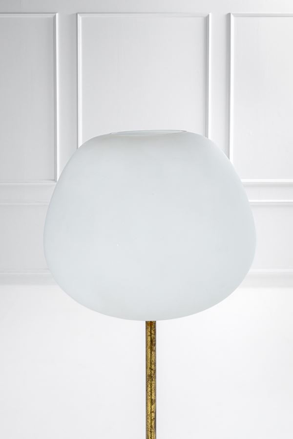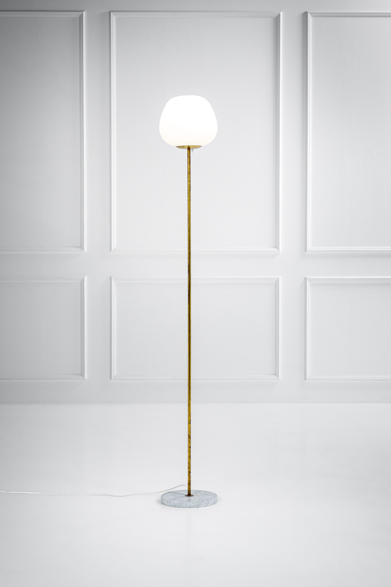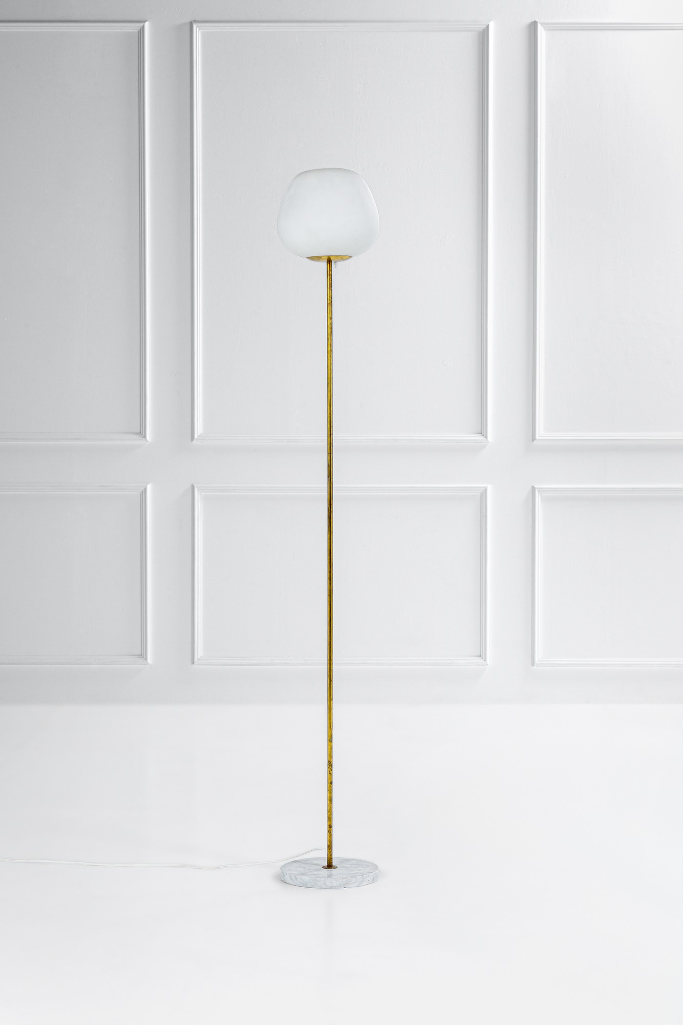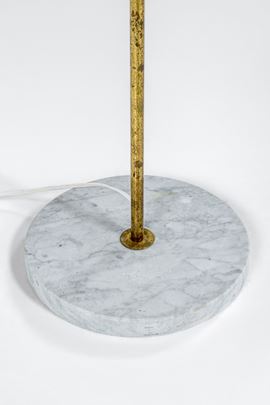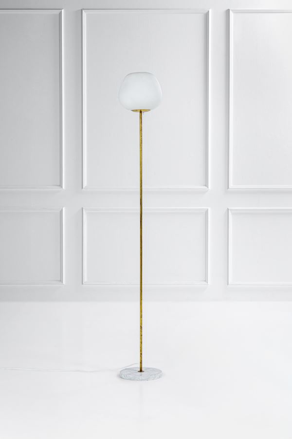 Metallo verniciato, ottone, marmo, vetro opalino satinato.