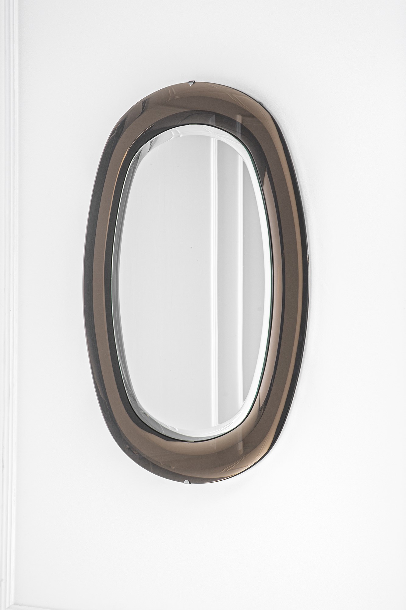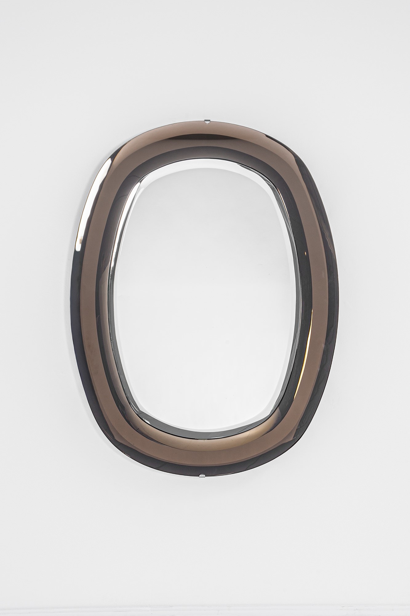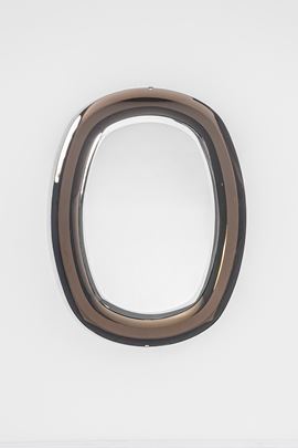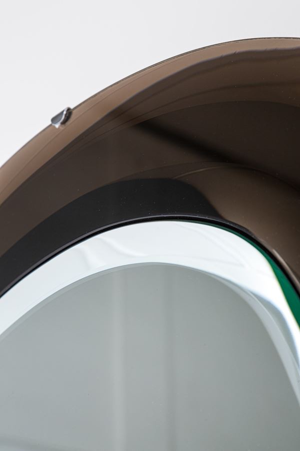 Vetro molato colorato fumé, vetro specchiato, metallo cromato.