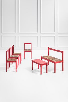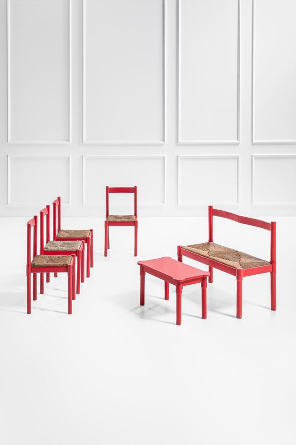 Salottino composto da quattro sedie, una panca ed un tavolino