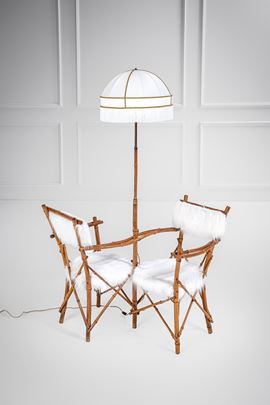 Salottino da giardino composto da una lampada da terra e due poltrone vis à vis