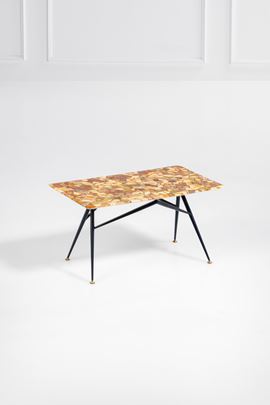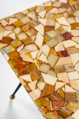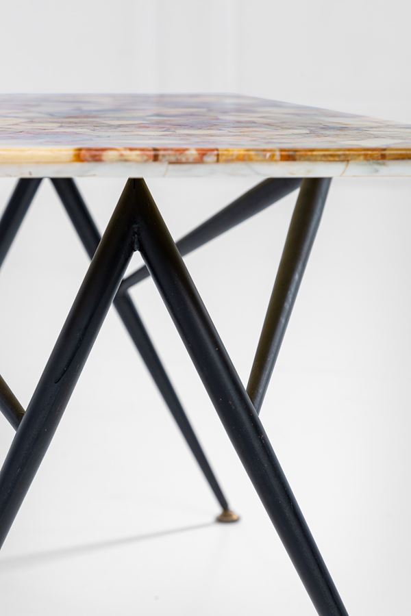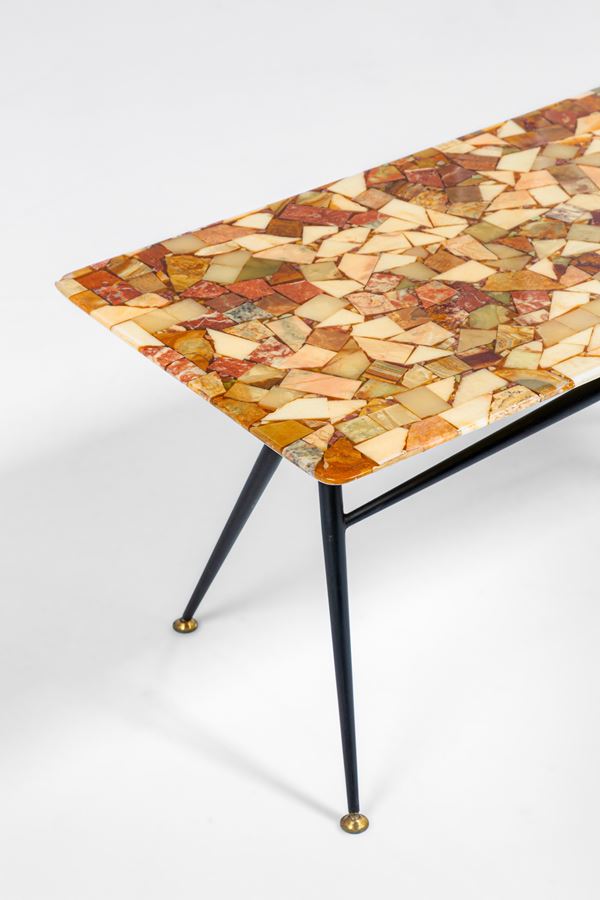 Metallo verniciato, ottone, piano composto da tessere di marmo di vari colori.