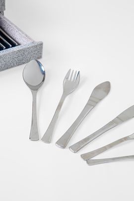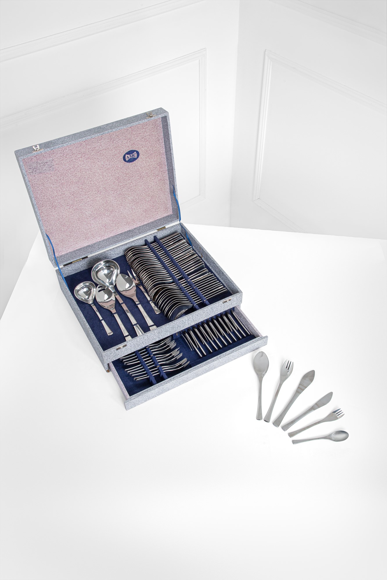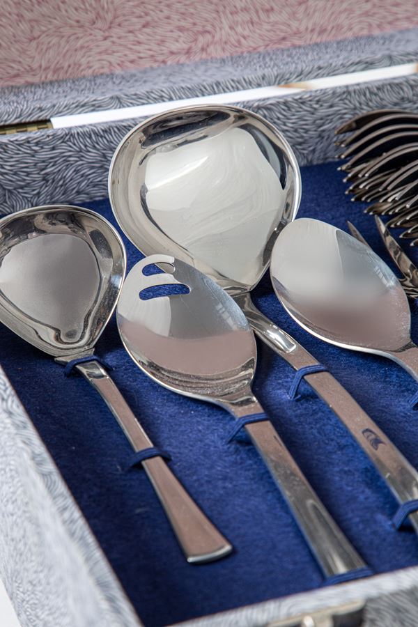 Servizio di posate entro scatola originale composto da: 12 cucchiai, 24 forchette, 12 coltelli, 12 cucchiai da dessert, 12 forchette da dessert, 12 coltelli da dessert, 1 forchettone, 2 mestoli