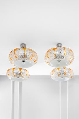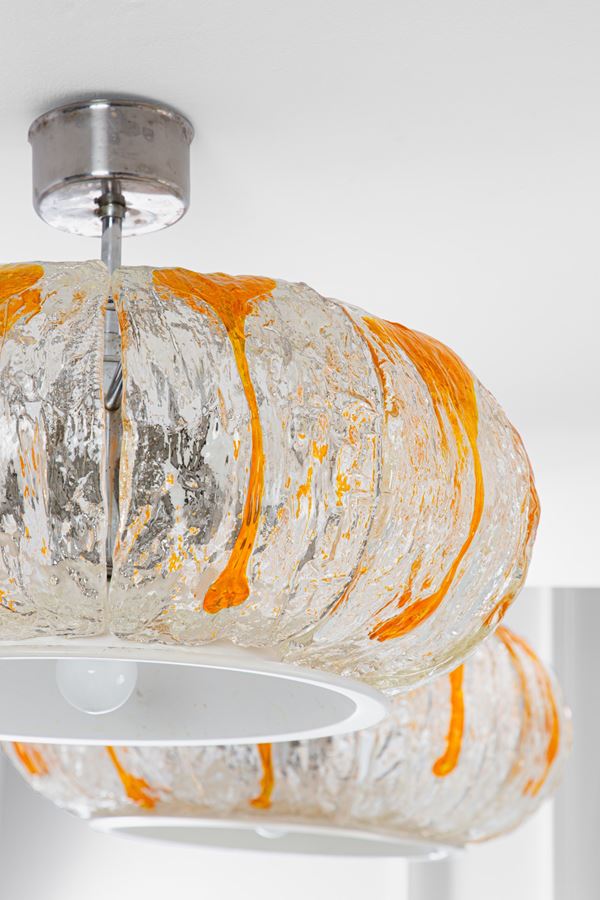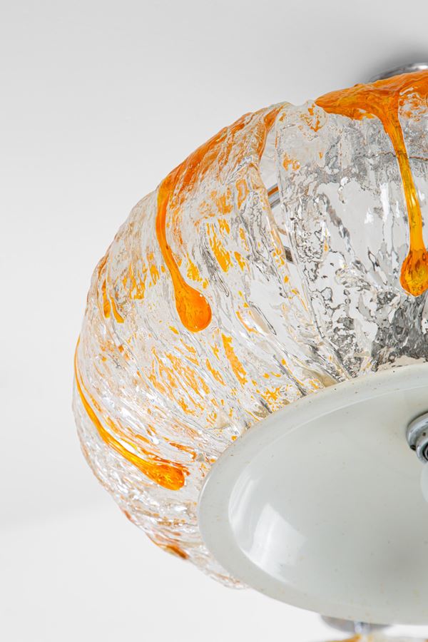 Vetro ghiaccio trasparente con inclusioni di vetro colorato, metallo verniciato, metallo cromato.