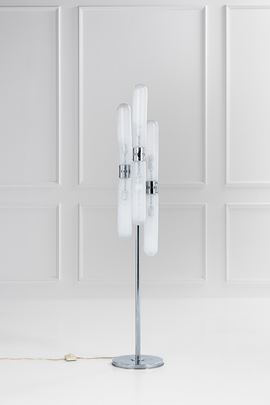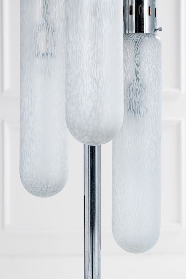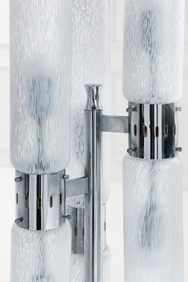 Metallo cromato, elementi in vetro trasparente satinato con macchie di vetro lattimo.