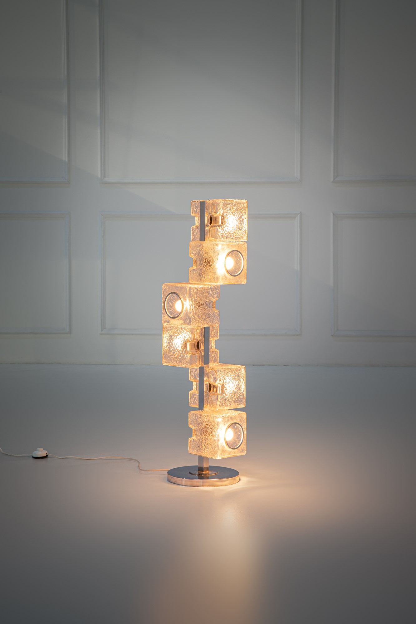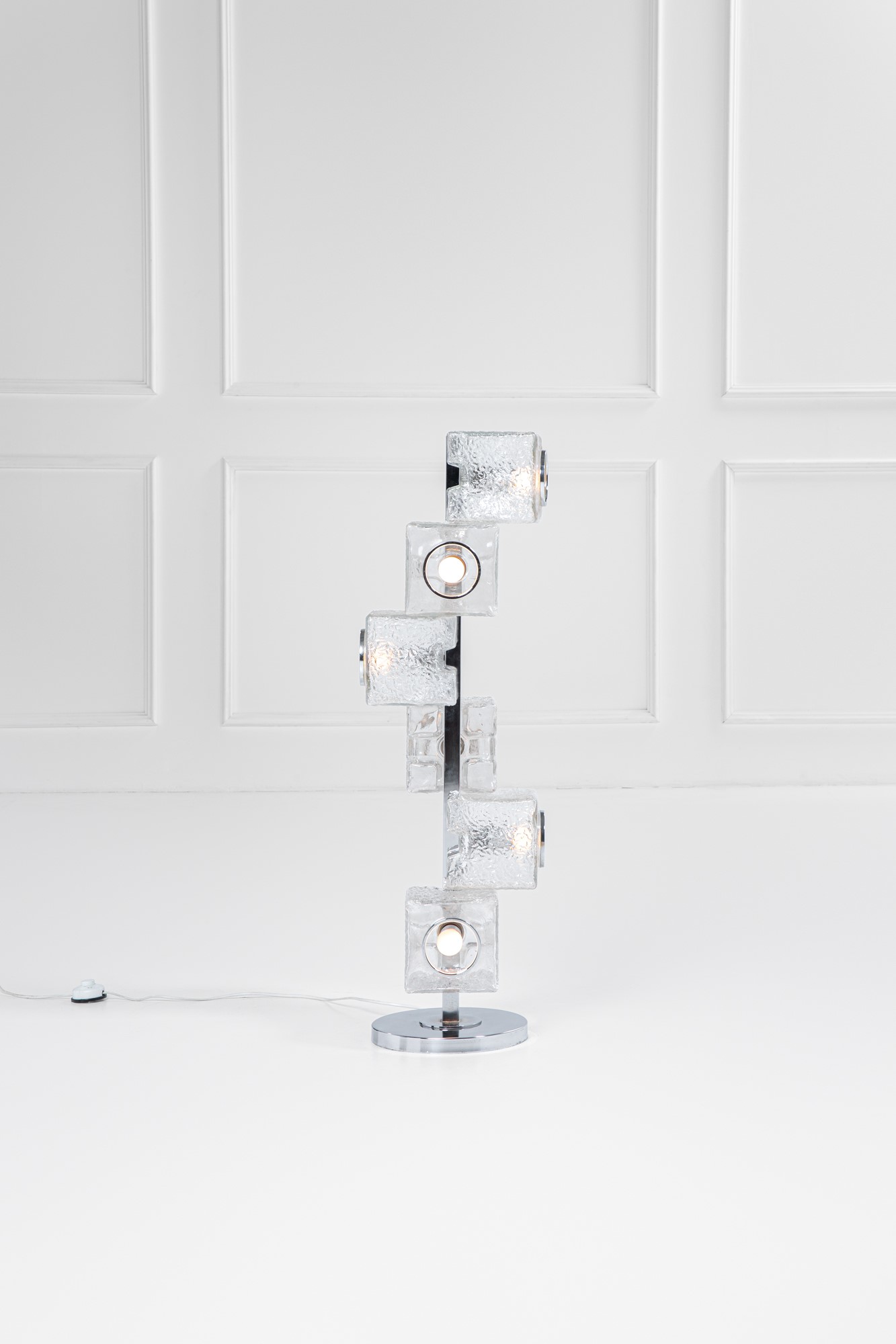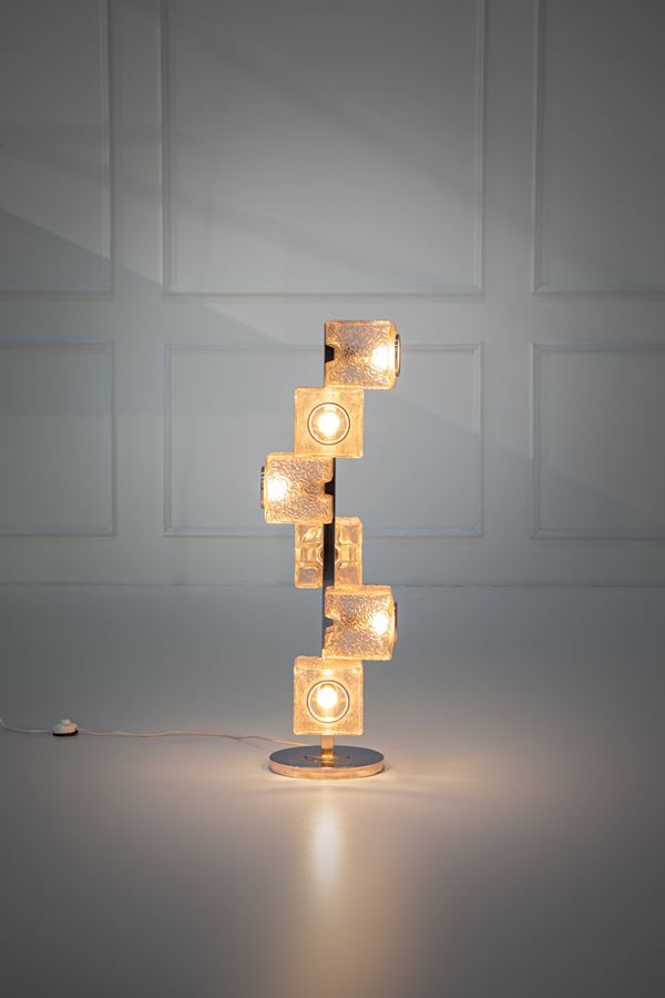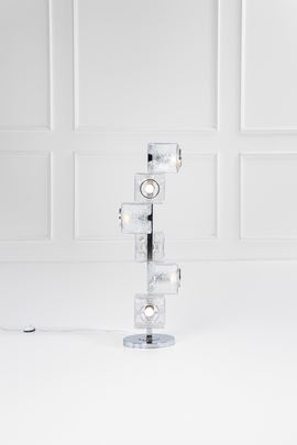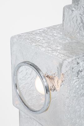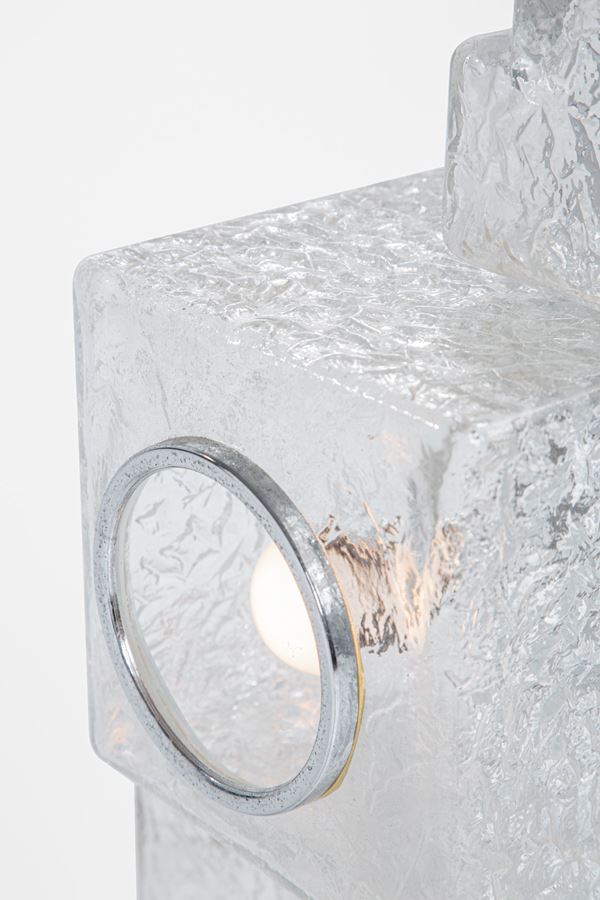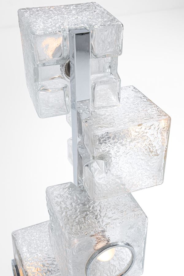 Elementi prismatici in vetro ghiaccio, metallo cromato.