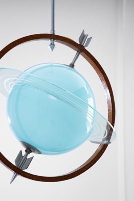 Vetro colorato, vetro trasparente, metallo cromato, legno massello sagomato.