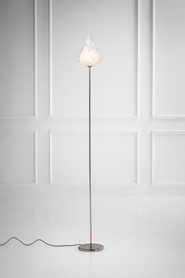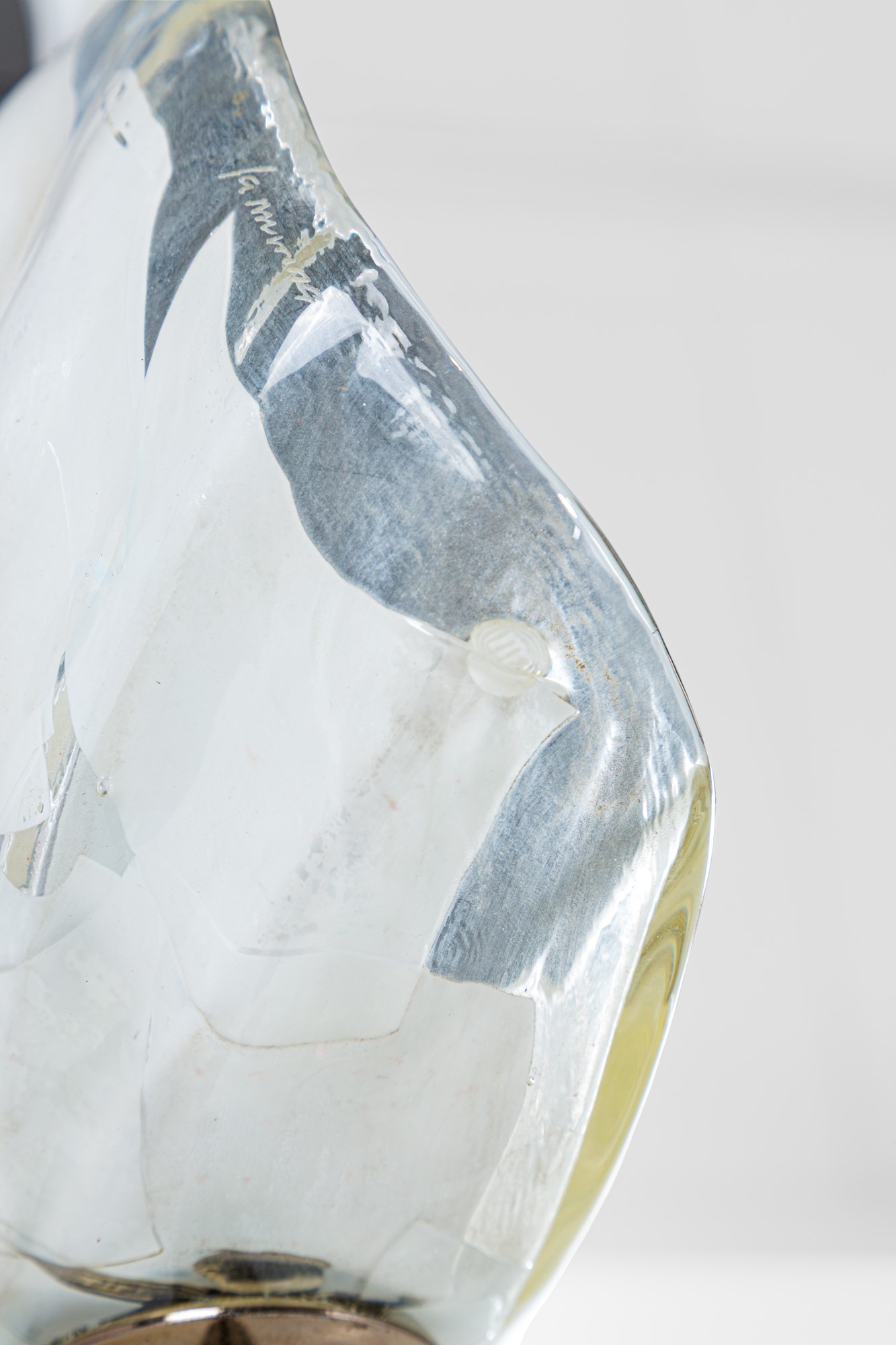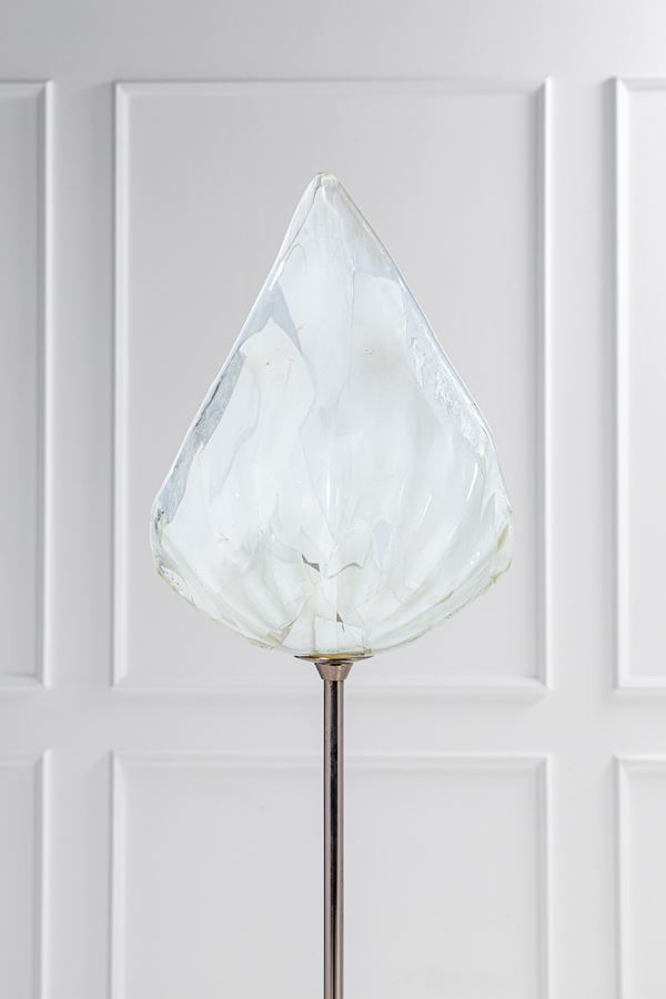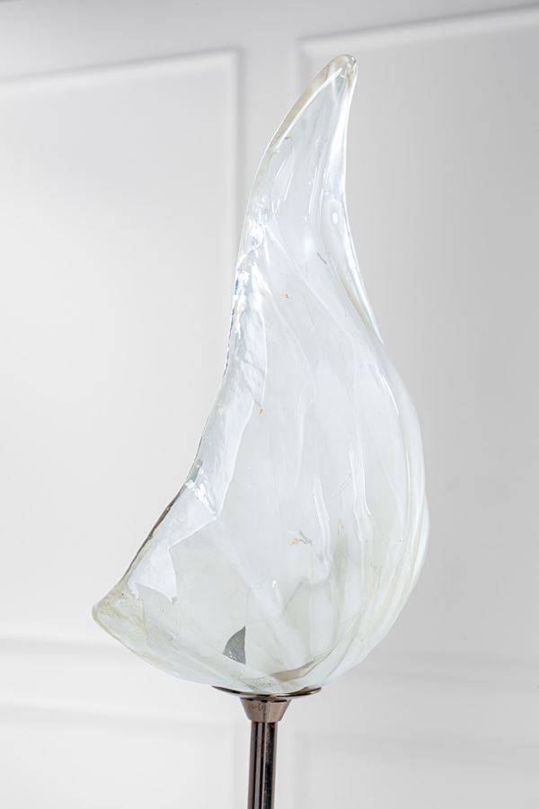Metallo nichelato, vetro di Murano trasparente con decoro a pennellate in bianco lattimo.