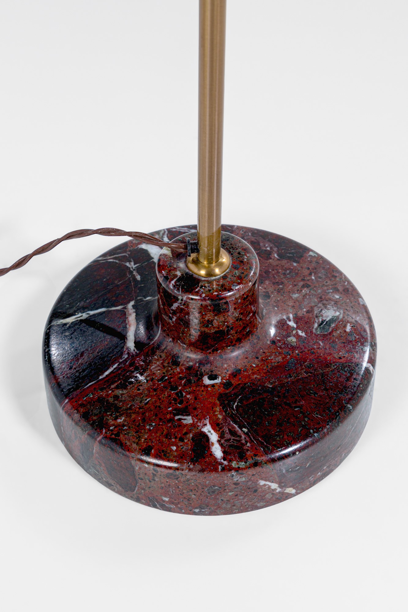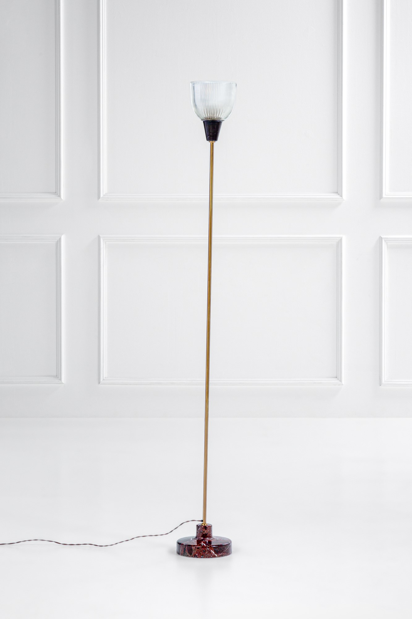 Alluminio anodizzato nero, ottone lucido, vetro prismatico, marmo tornito.
