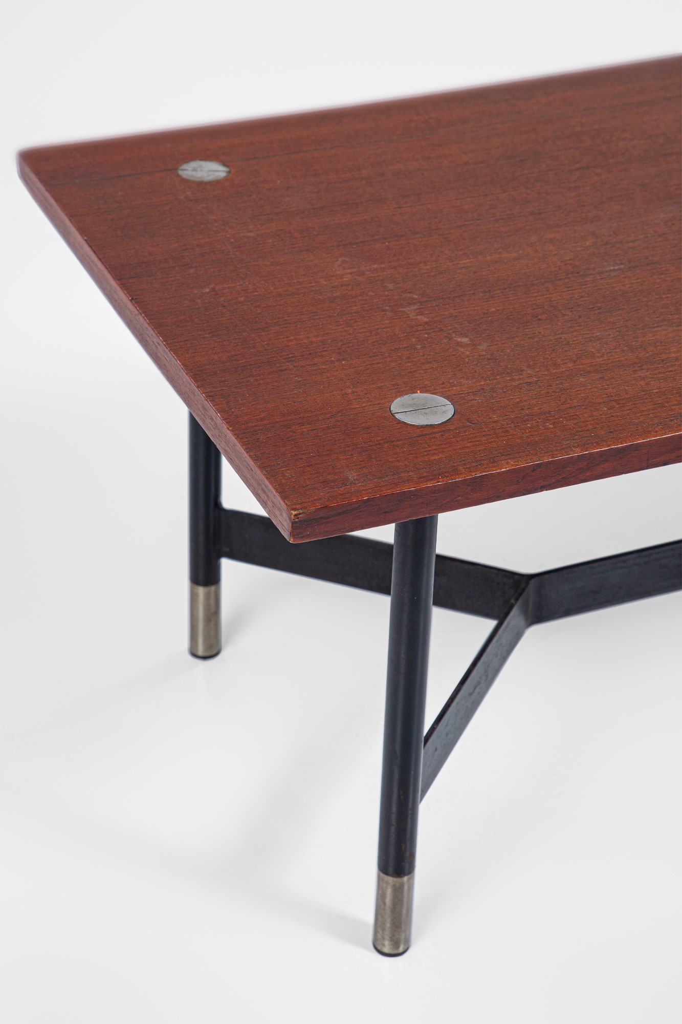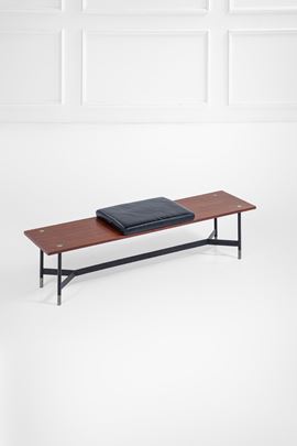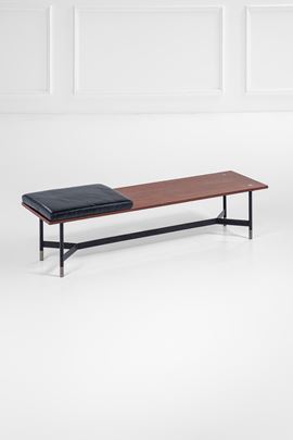 Legno impiallacciato, ferro verniciato, metallo nichelato, pelle.