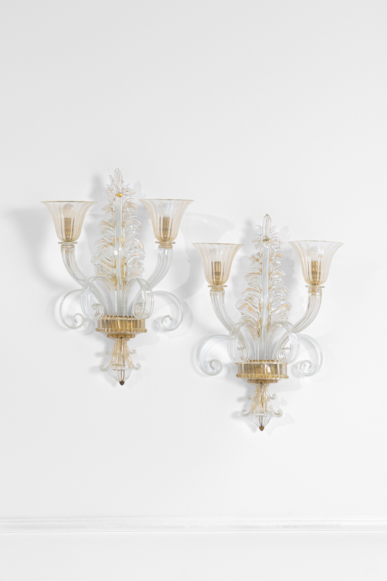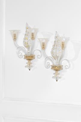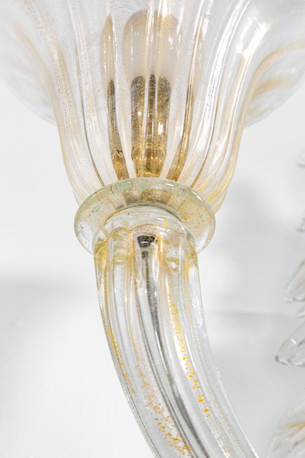 Elementi in vetro di Murano a motivi vegetali, vetro trasparente con inclusioni d'oro, ottone.