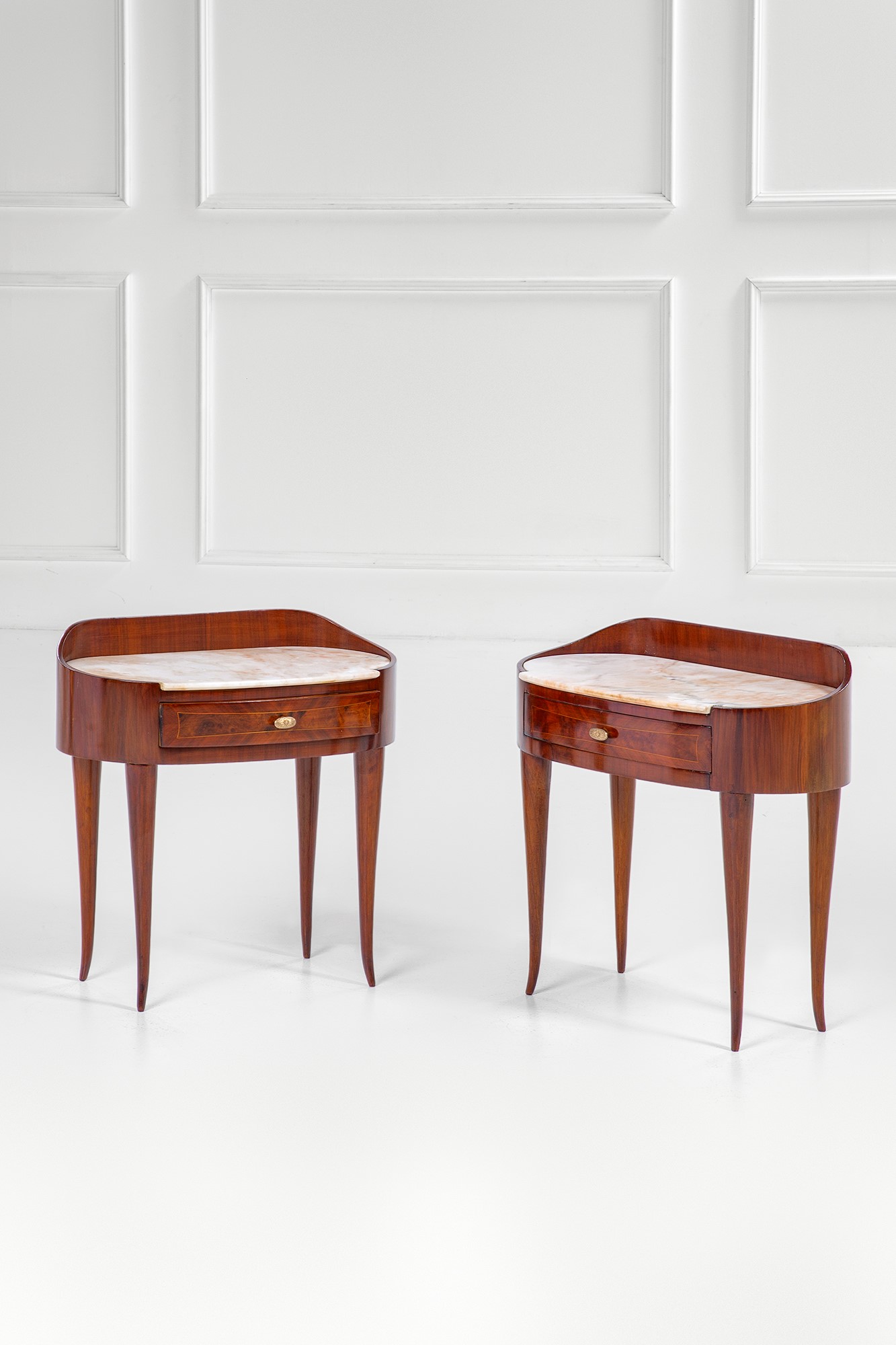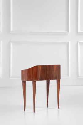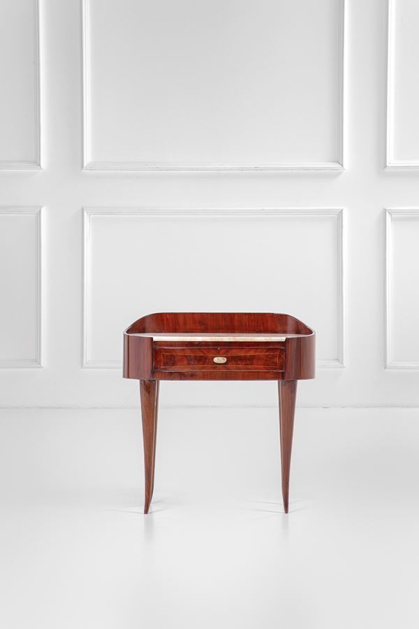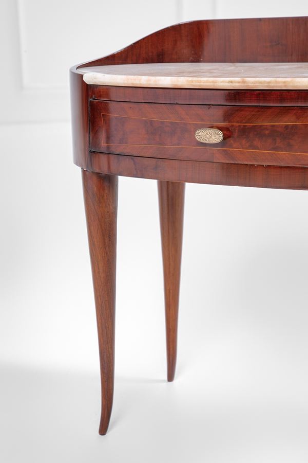 Legno massello, legno impiallacciato, intarsi in legno chiaro e radica, ottone, marmo.