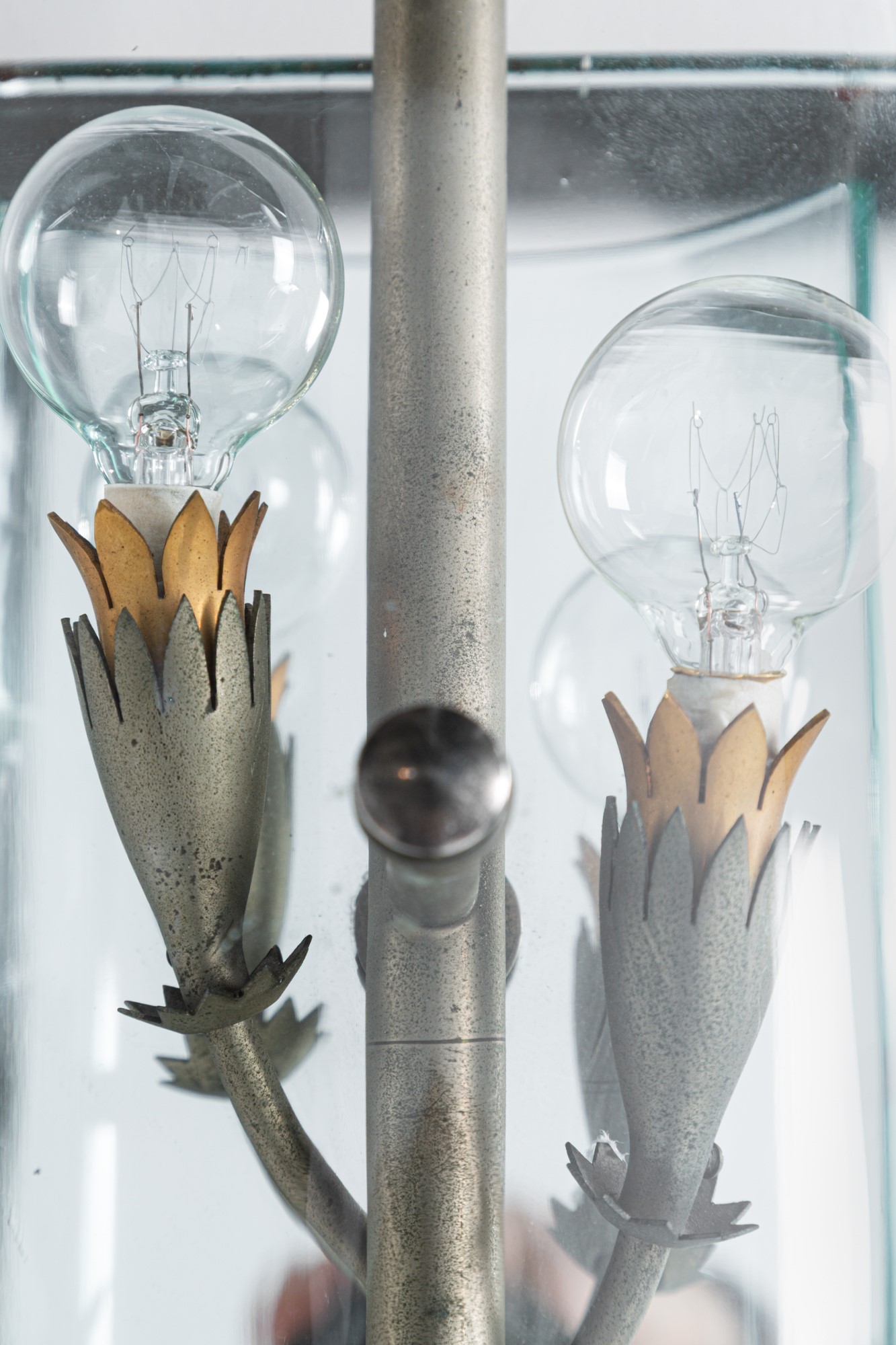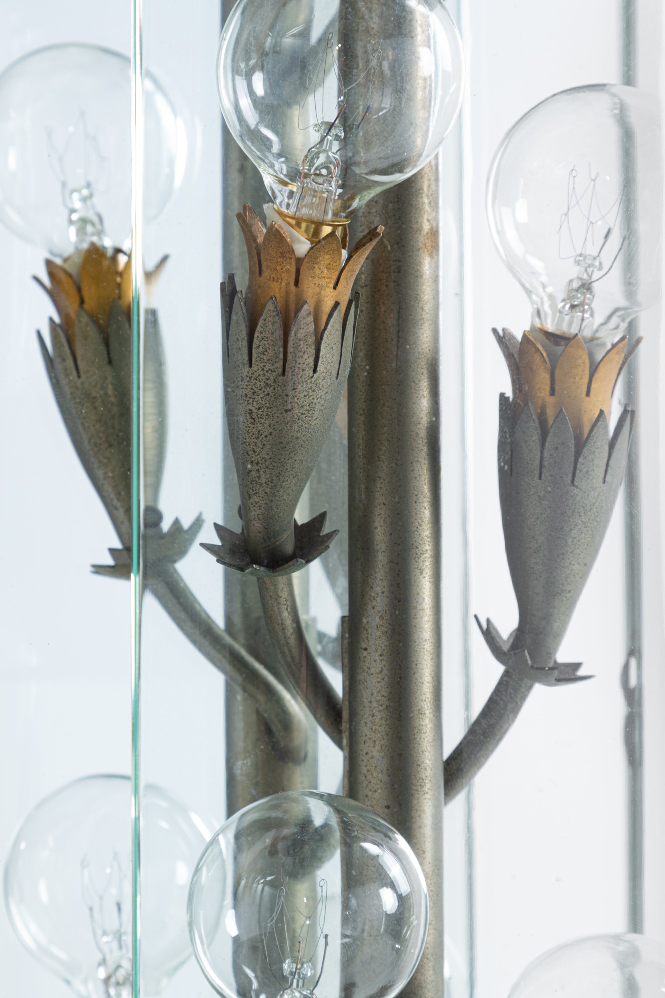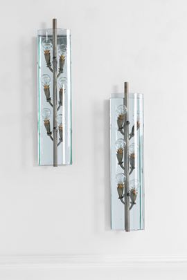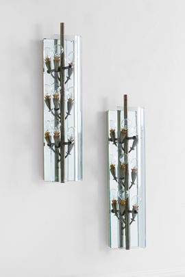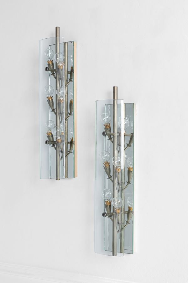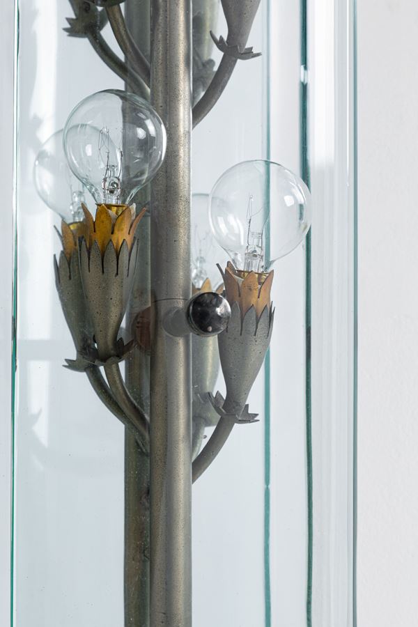 Cristallo curvato, vetro specchiato, ottone lucido, ottone nichelato.