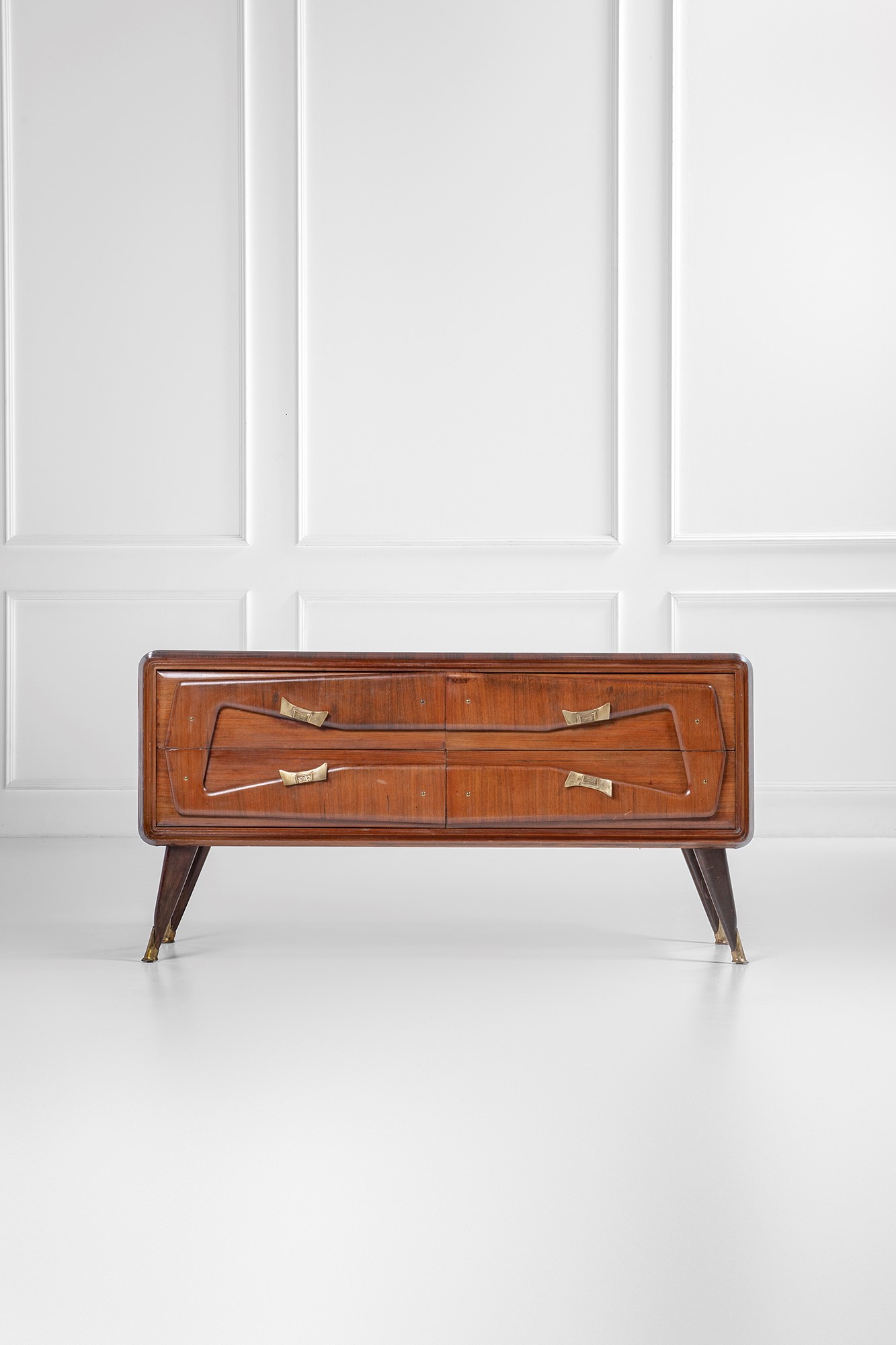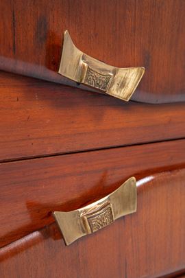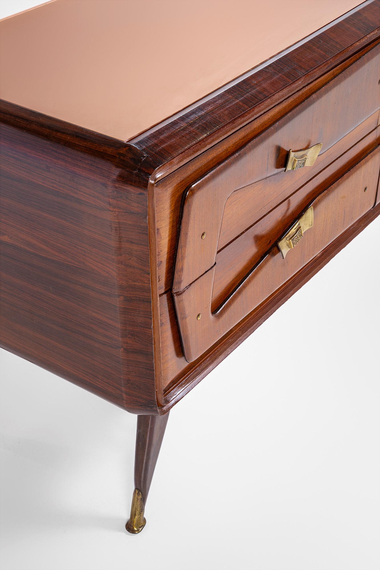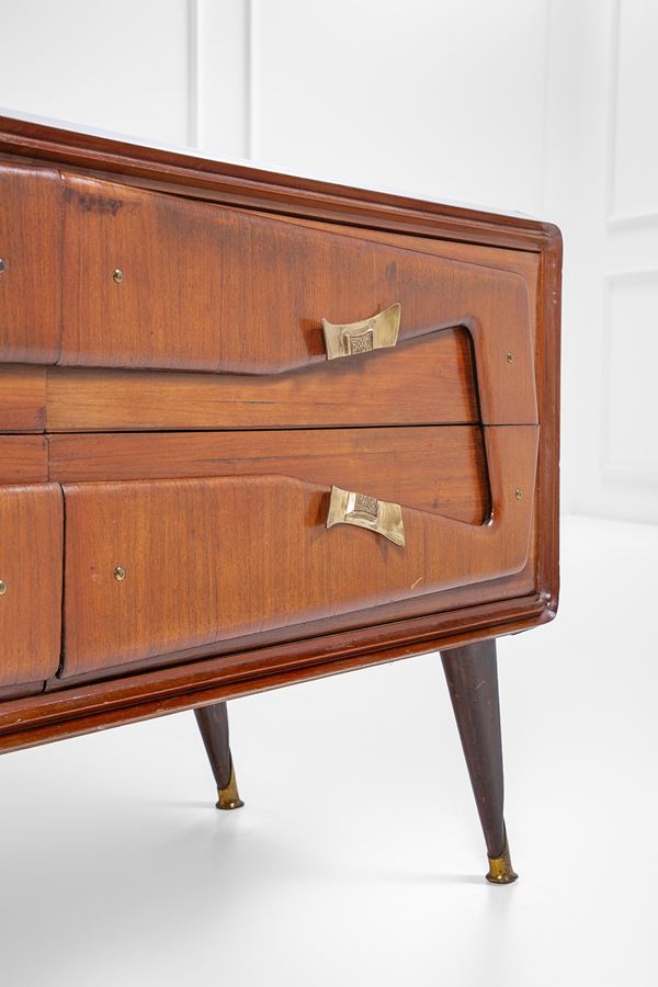 Legno impiallacciato, legno massello, ottone, vetro colorato.