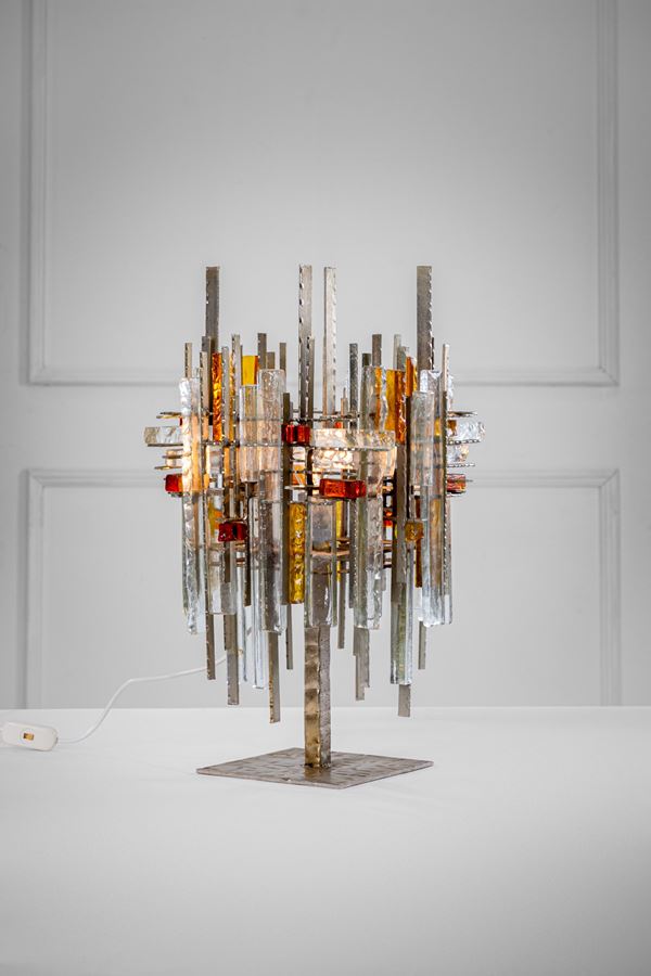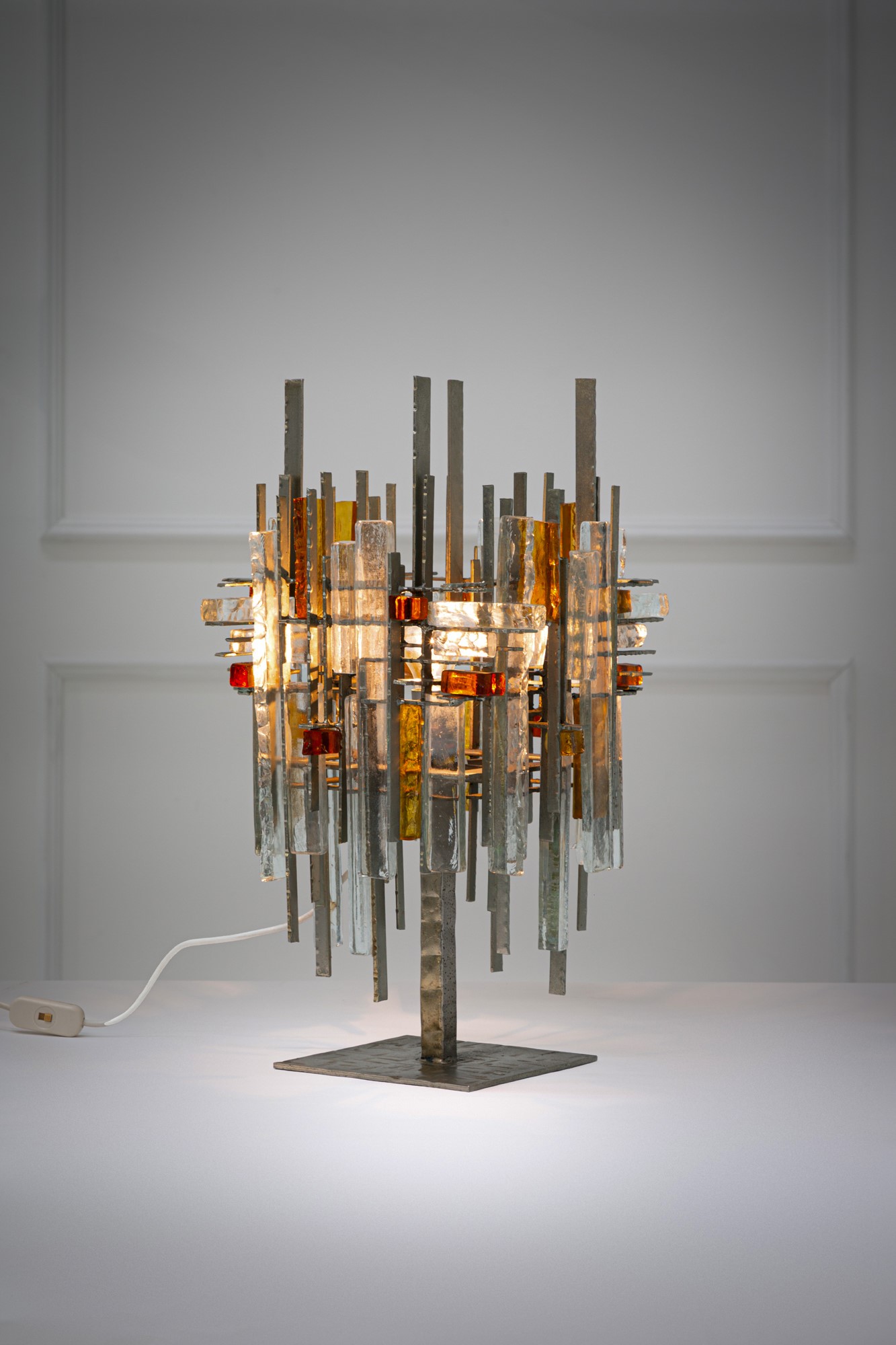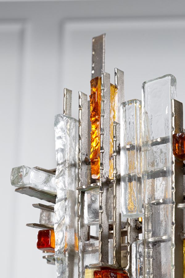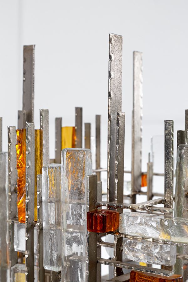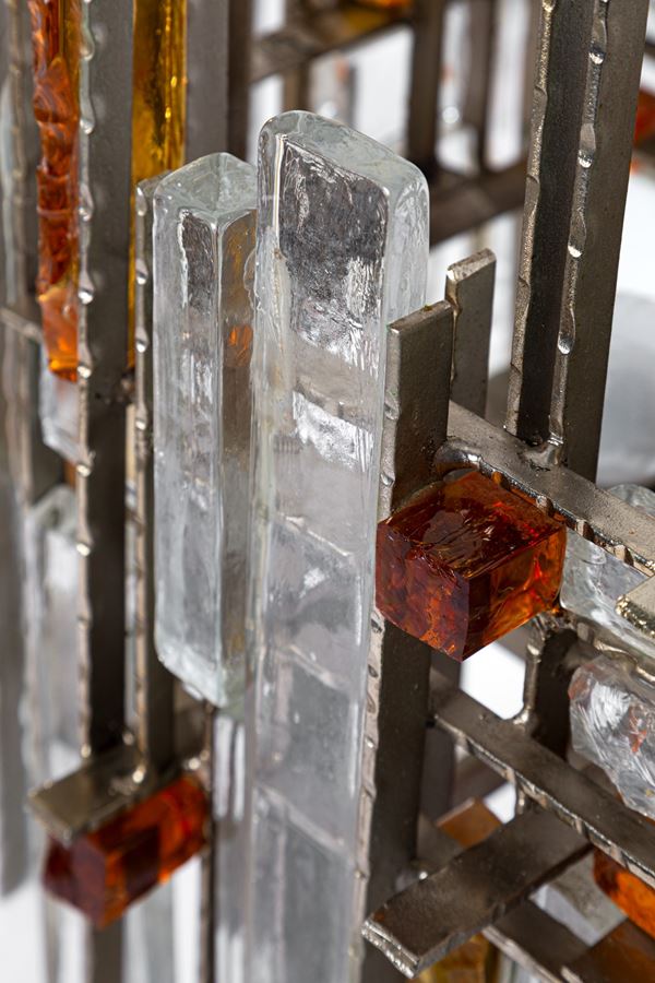 Elementi prismatici in cristallo grezzo trasparente e ambra, ferro battuto.