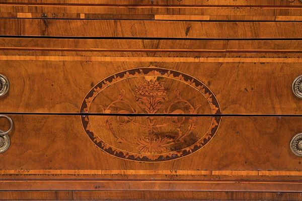 Comò lastronato in noce e filettato in legni chiari, decorato con medaglioni, fronte a tre cassetti, gambe piramidali.