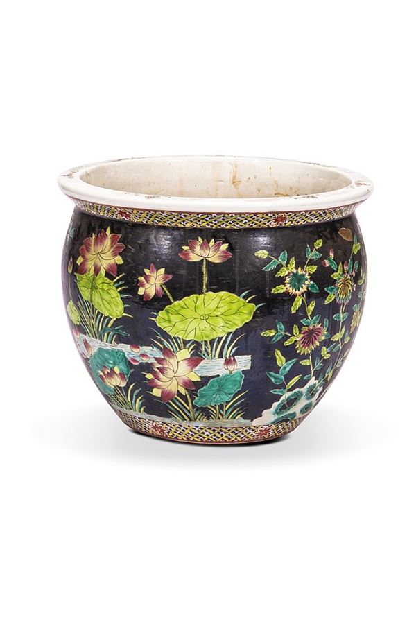 Due cachepots in porcellana dipinta in policromia a fiori su fondo nero.