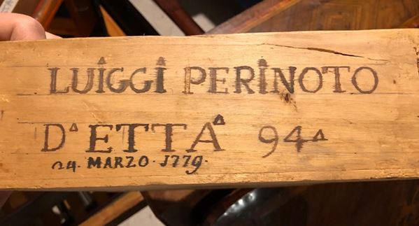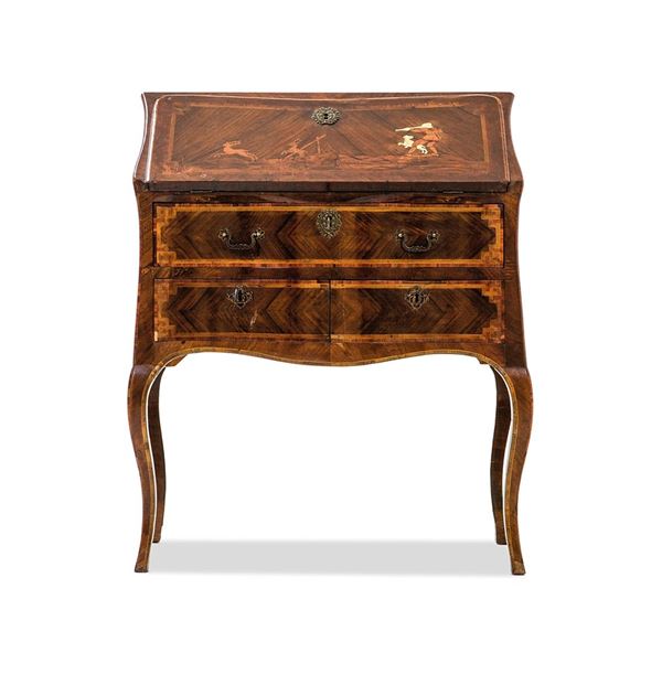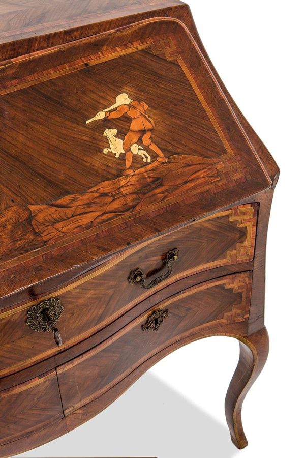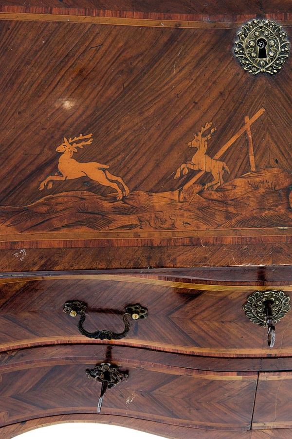 L'interno dell'abattant è costituito da tiretti e vani a giorno, la facciata è decorata da una gustosa scena di caccia al cervo con intarsi in legno chiaro e avorio.