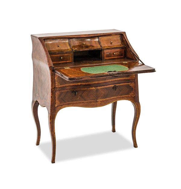 Scrivania a ribalta lastronata in noce e filettata in legno chiaro.